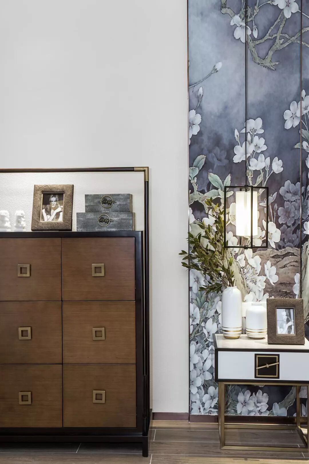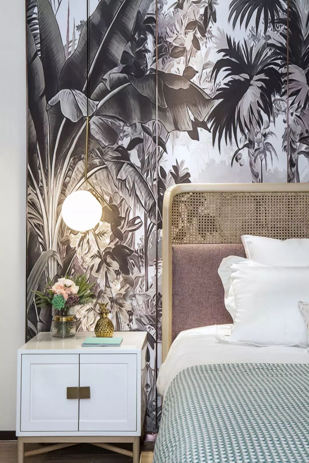 床头背景墙为整个空间的设计定下主题。雅致的梨花、水墨工笔细描的雨林、竹叶山石纹,都传递着传统中式温婉典雅的审美情趣。