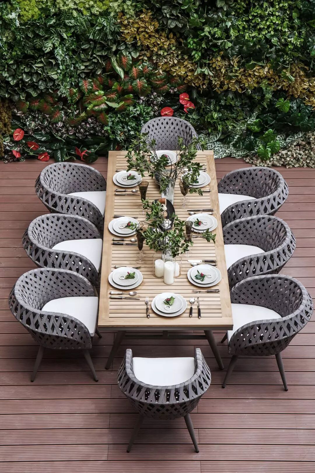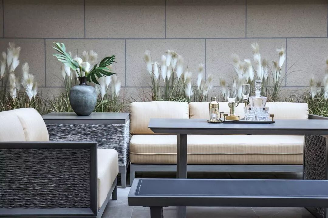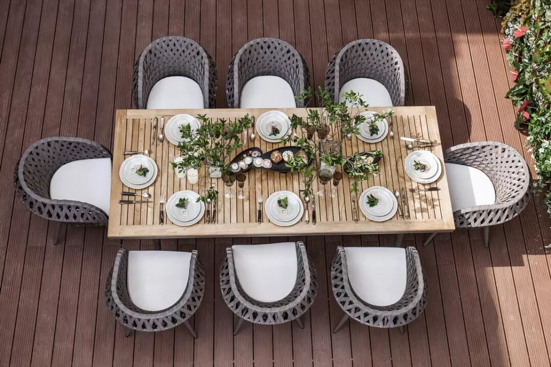 庭院露天餐桌是室内空间的美好延伸。一边用餐,一边充分享受灿烂明媚的夏日阳光,花开正艳,晴空白云。