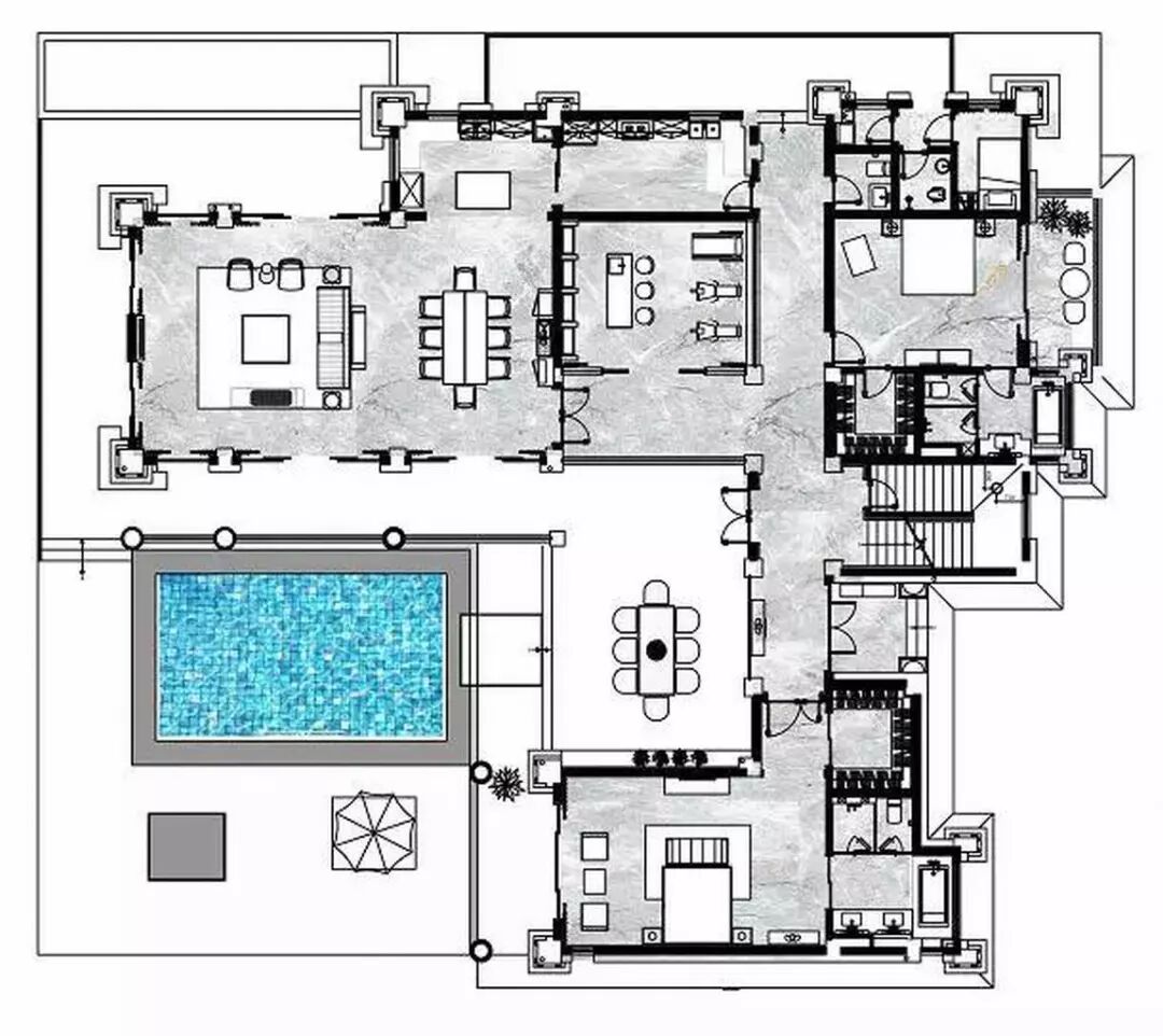 室外是一个凸显功能性的空间。蓝色马赛克游泳池像一块宝石嵌在庭院中。绿植只作为点缀。设计大方的休闲椅和色调典雅的地砖营造出有如海滨一般舒适闲散的氛围。