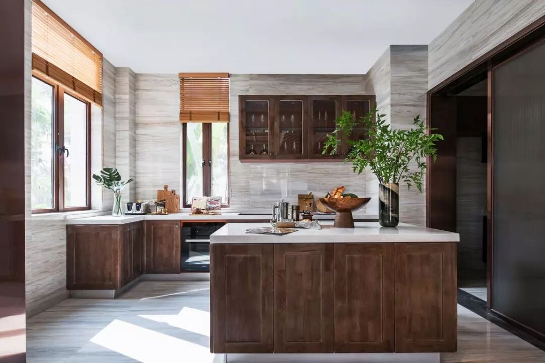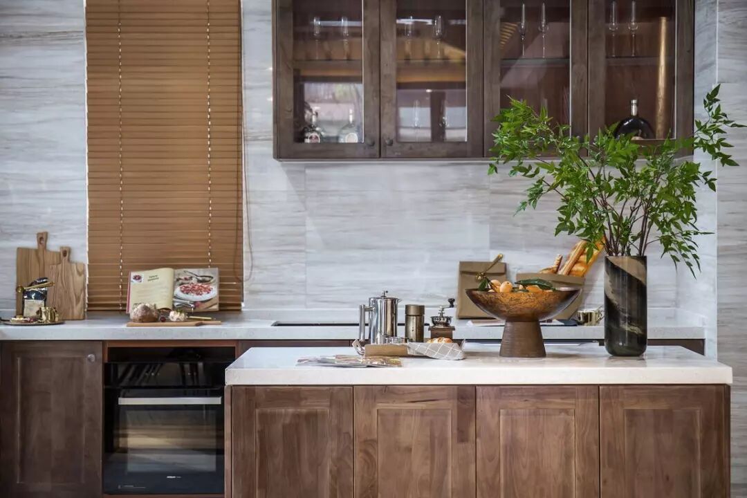 餐厅与半开放厨房相连,兼顾功能与视觉效果。大理石、瓷砖、白色台面材料相结合,整体感觉奢华又整洁。