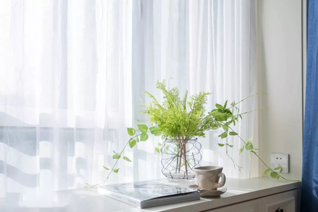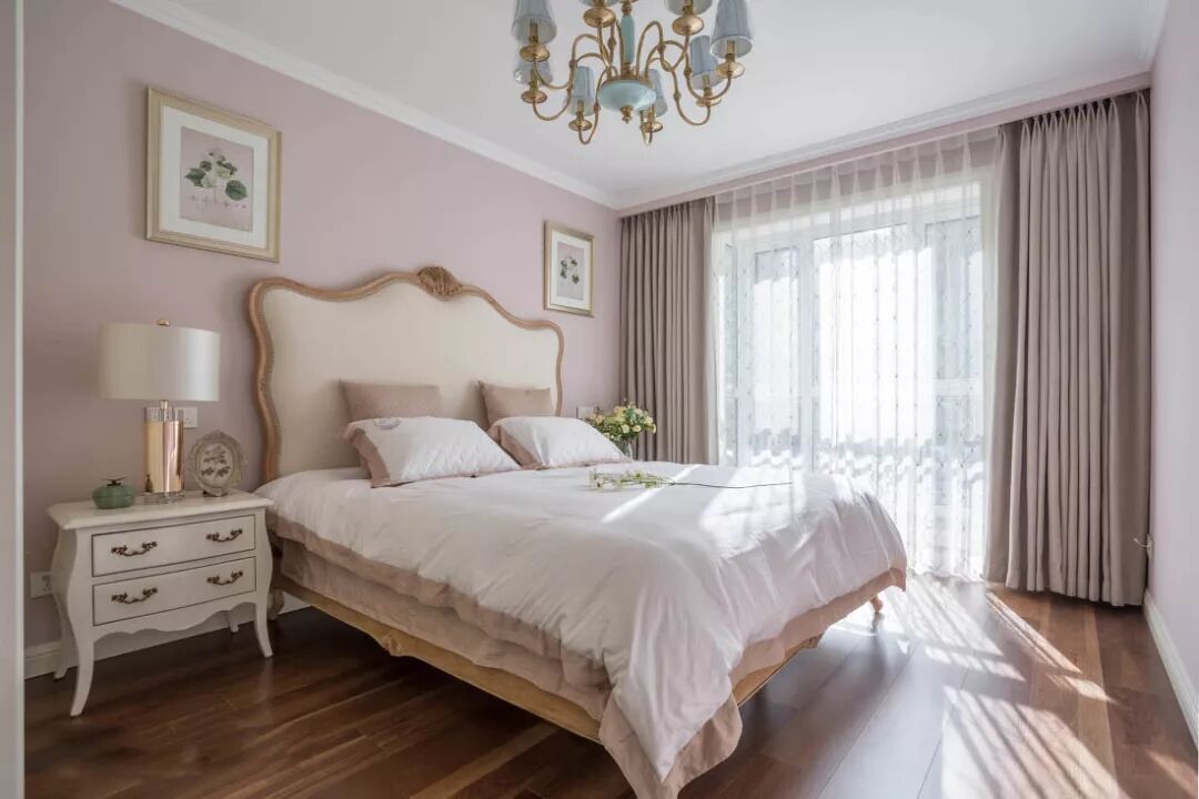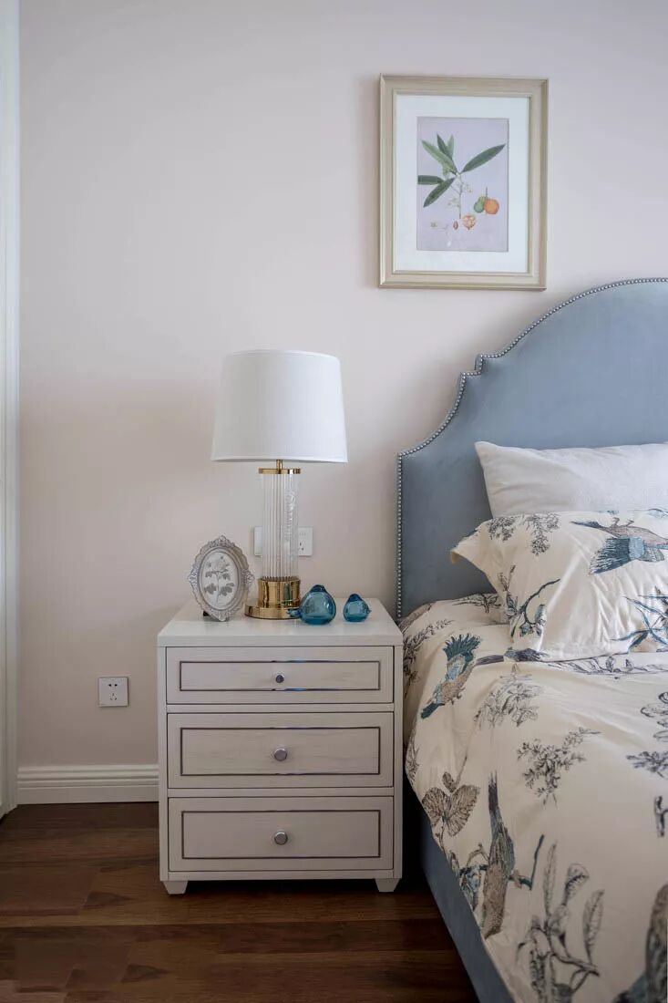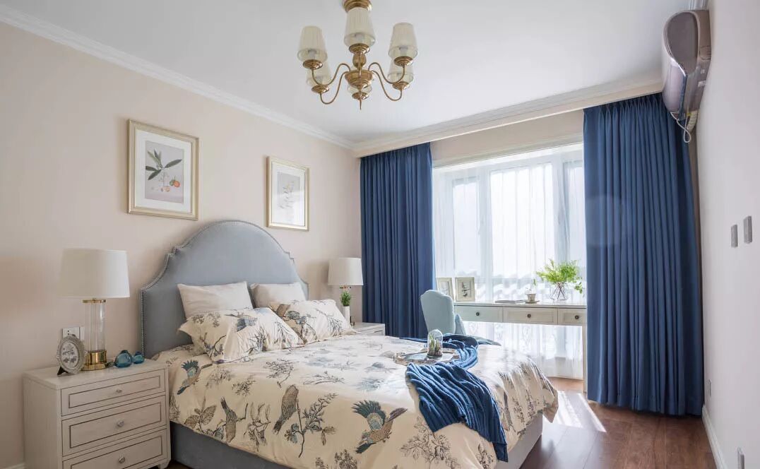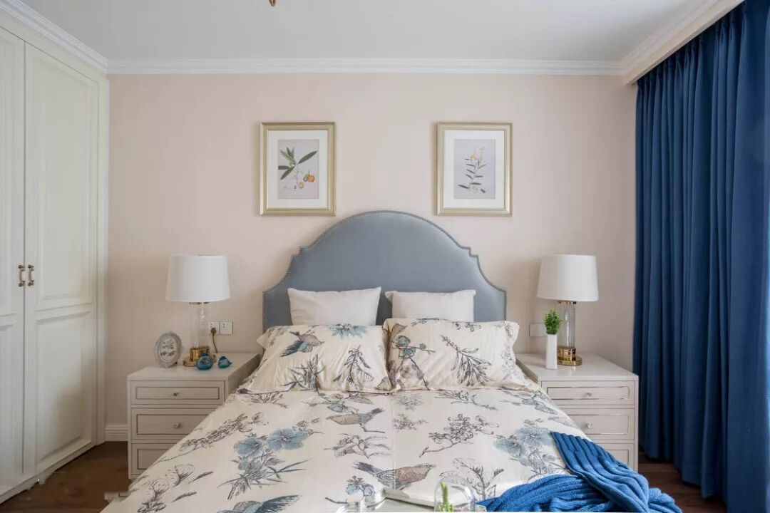 与主卧相比,次卧的色调更为丰富。浅色花鸟印花床品与深色窗帘相互呼应,一深一浅,让空间层次更丰富。