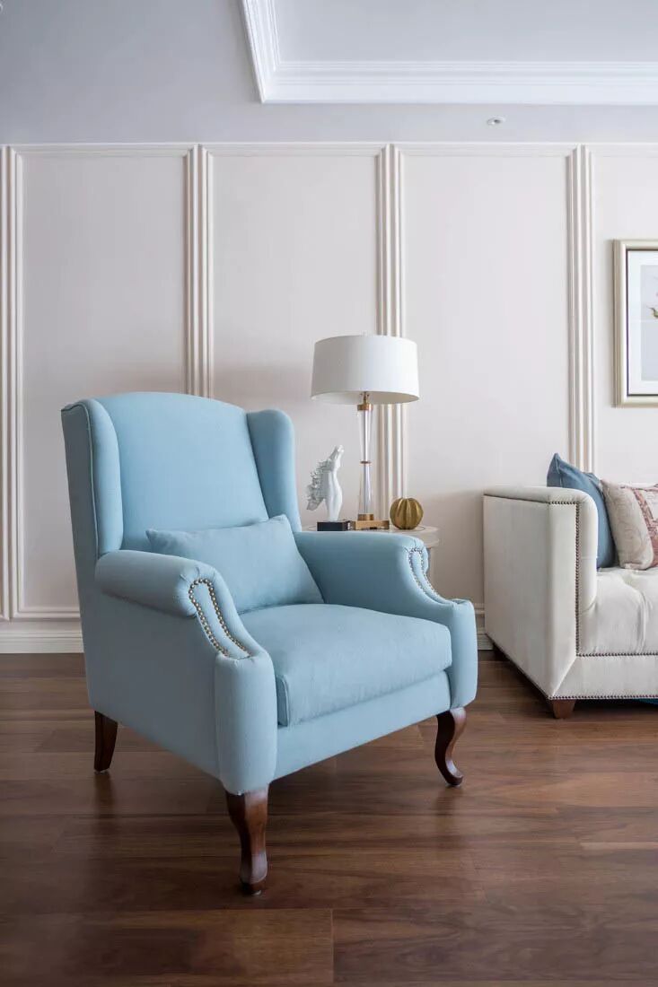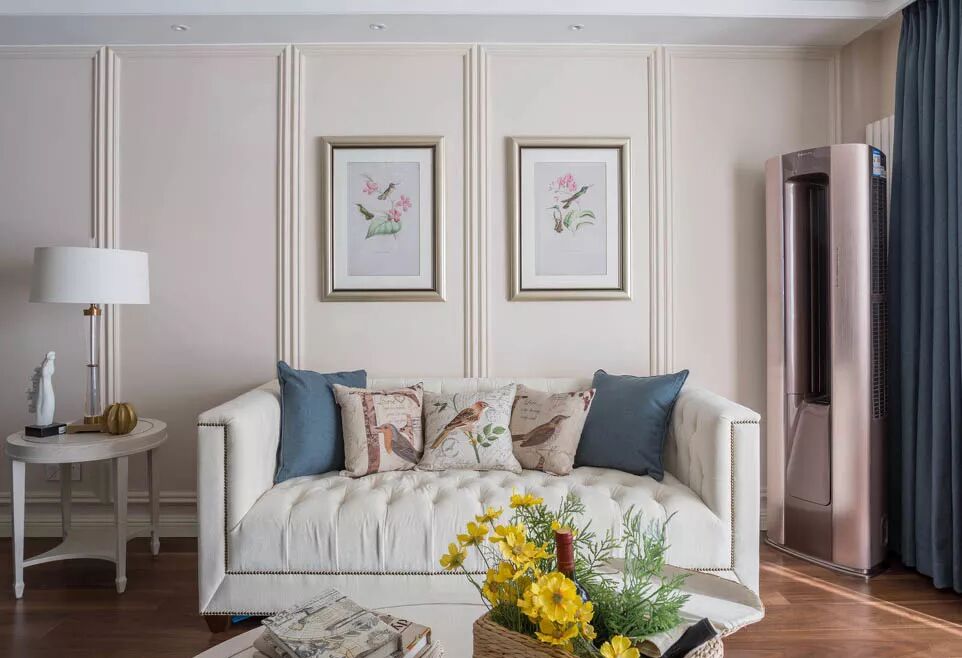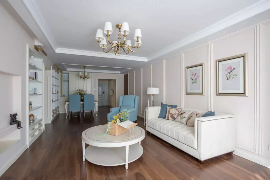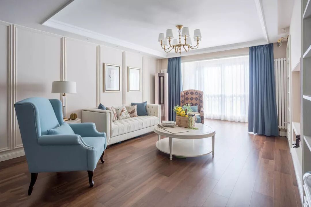 本案为现代美式风格,整体以柔和的米白色与蓝色系作为主色调。设计师选用环保的水性漆与保持本质的开放漆工艺,让家具的自然纹理更加清晰,打造出一个优雅精致、却不失清新自然的现代居室。