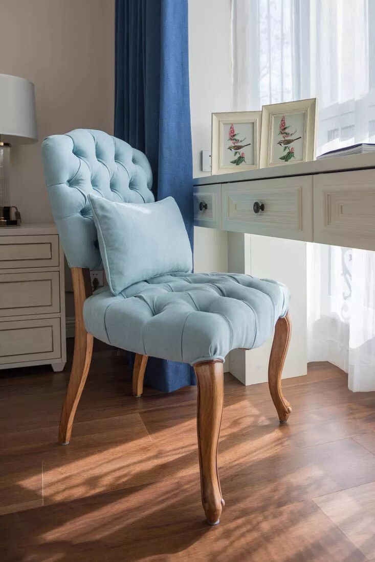 窗边的书桌是卡在墙面上的,这也是次卧设计的一大亮点。白色窗桌搭配蓝色布艺单椅,清爽大气,十分上档次。