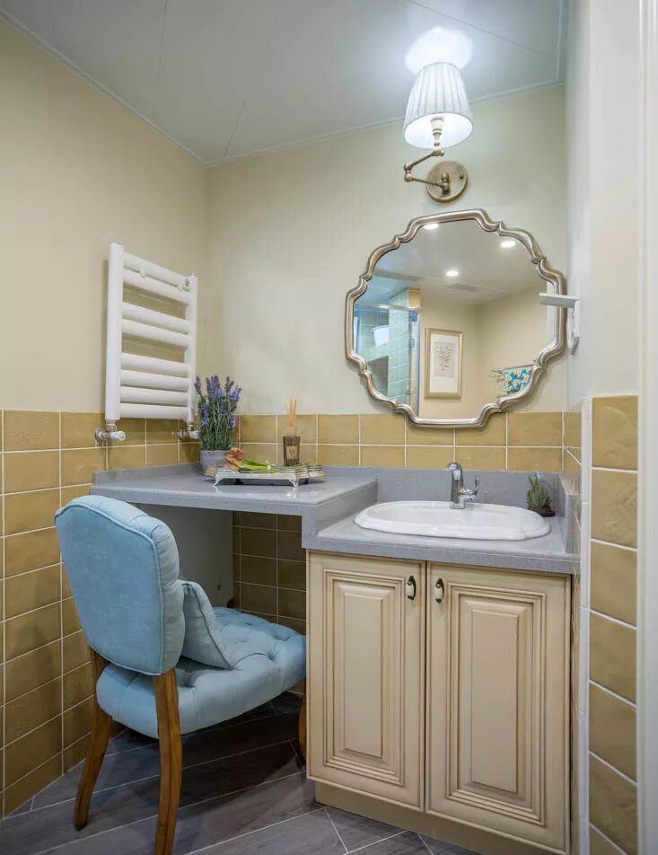 洗手台选择了组合款,一边为洗手区,安装有白色水槽、几何装饰镜;一边为护肤区,女主人可在台面上放置各类护肤品,洗完澡后坐在椅子上完成自己的每日护肤任务。