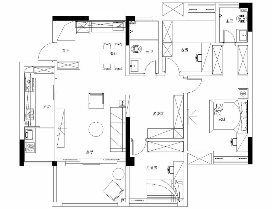 将原儿童房改造成多功能活动区域,用吧台设计作分割。另外,吧台还可以作为临时工作区来用。