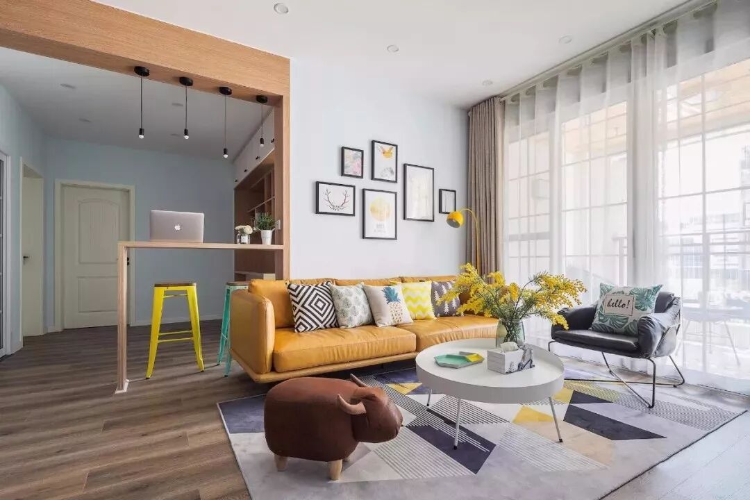 亮黄色沙发搭配灰色墙面,明暗结合,空间层次感强;地面通铺木地板,简约顶面用点光源取代主灯,空间宽敞明亮。