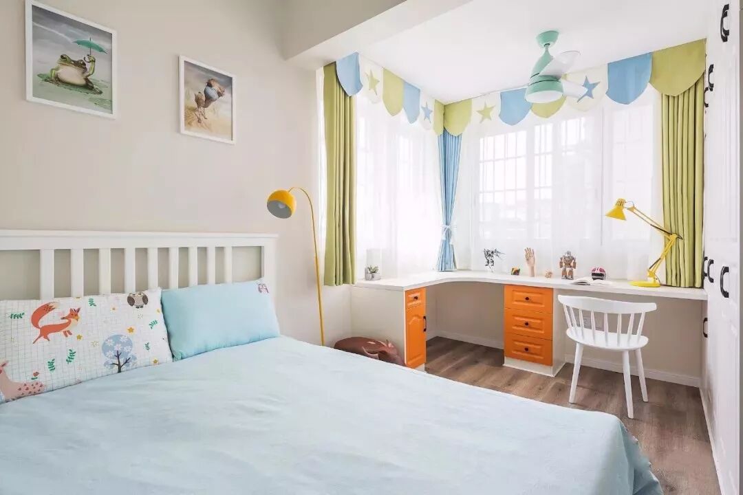 儿童房选择了色调柔和的绿色、蓝色,靠窗安装了L型木作写字台,增加空间机能。