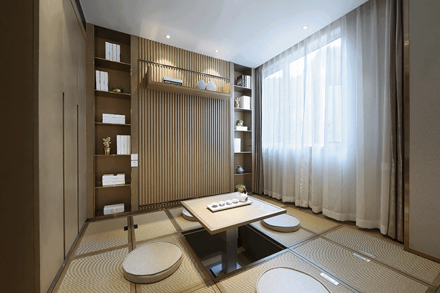 这个榻榻米空间,榻榻米空间的中间是一个升降台,在这里可以喝茶或者互动游戏。