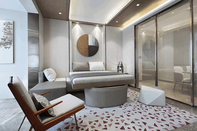 沙发墙上方的吊顶还藏了一张升降床,需要的时候就可以放下来,把客厅变成小客房。