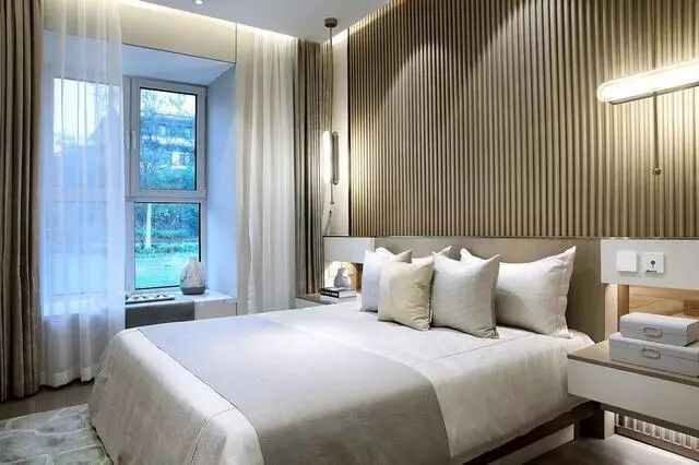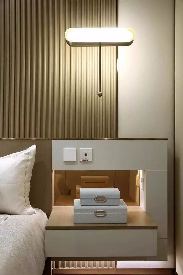 卧室床头背景墙也是凹凸木板造型,两侧定制床头柜与壁灯,让空间显得更加情趣自然。