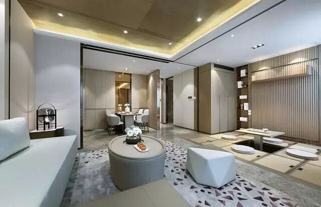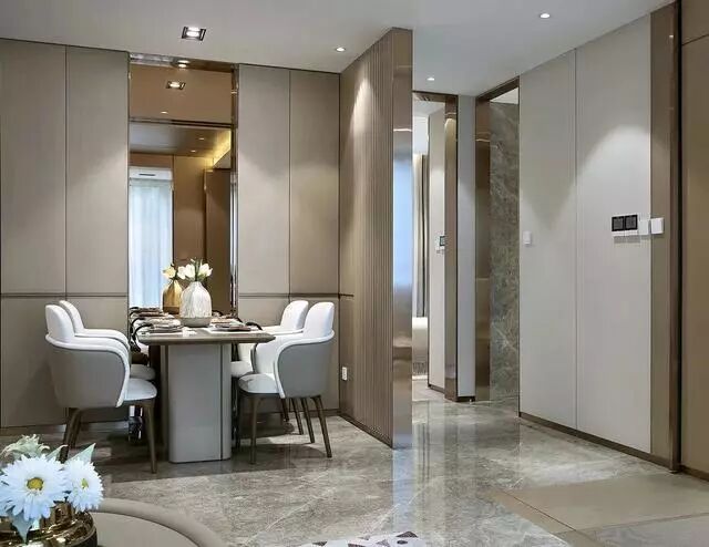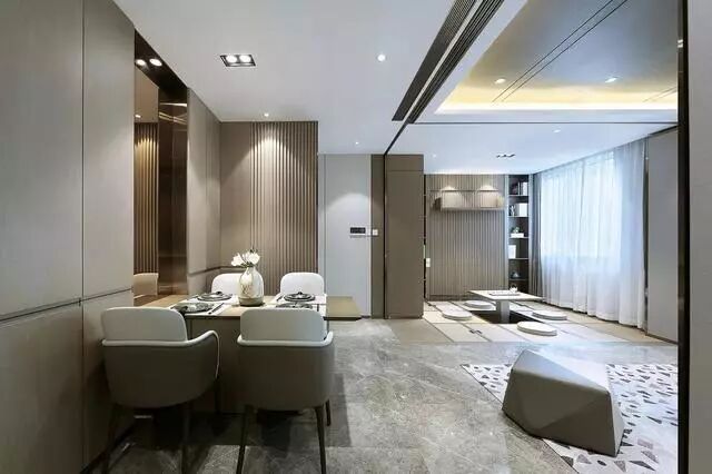 灰色大理石地砖+吊平的天花,取消了主灯设计的客餐厅,以灯带+筒灯为照明设计,整体光线环境更加均匀舒适。