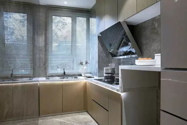 香槟金色的橱柜与灰色大理石地砖墙砖的布置,把厨房装扮得轻奢而又档次感。
