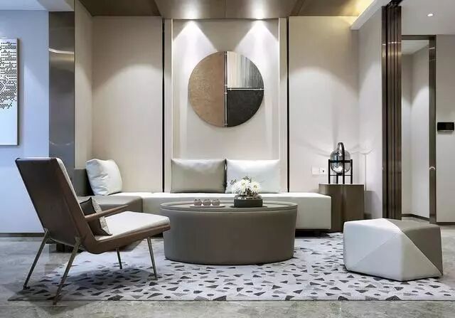 一套现代舒适的皮沙发,搭配一个小方凳与一张沙发椅,显得气质而又舒适。沙发墙上一个圆形的造型,分成三块分别是棕、银、黑的搭配,结合顶上射灯的衬托,现在现代而又优雅。