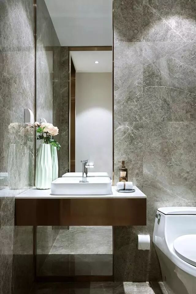 卫生间大理石墙面地面搭配,铜制洗手盆与镜框,在白色大理石洗手台上摆着优雅的插花,显得轻奢而又优雅。