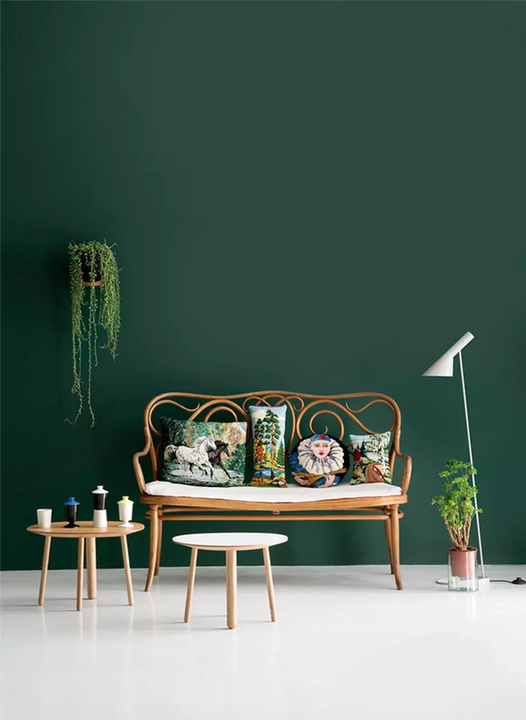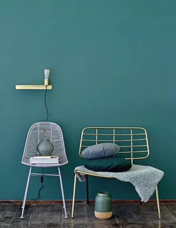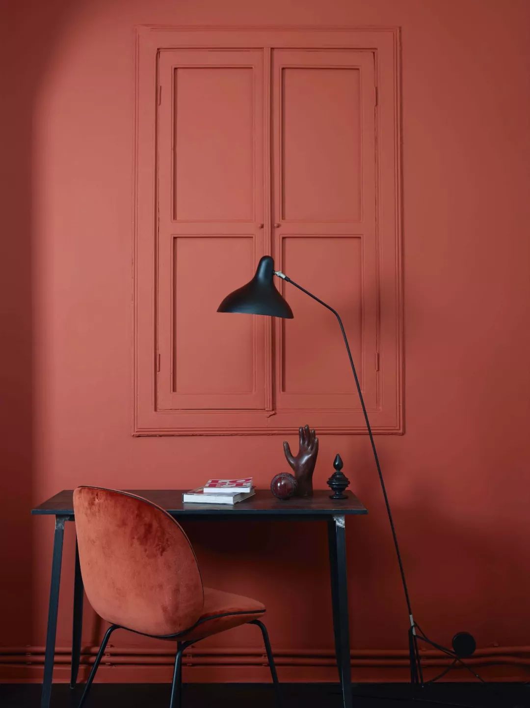 这种颜色可以融入室内,作为卧室或餐厅的装修特色墙,并与金色或黄铜色调和装饰、搭配。