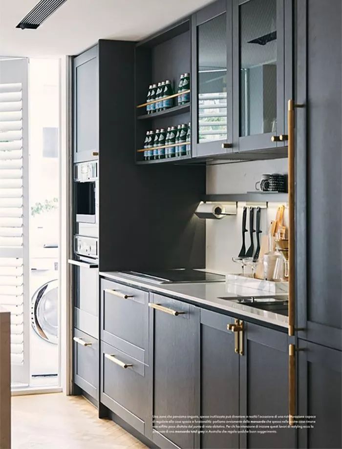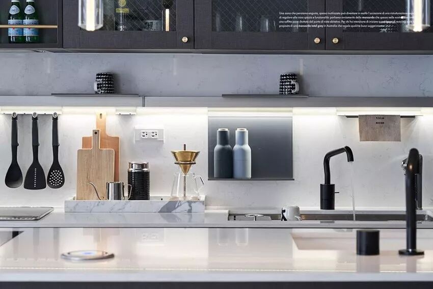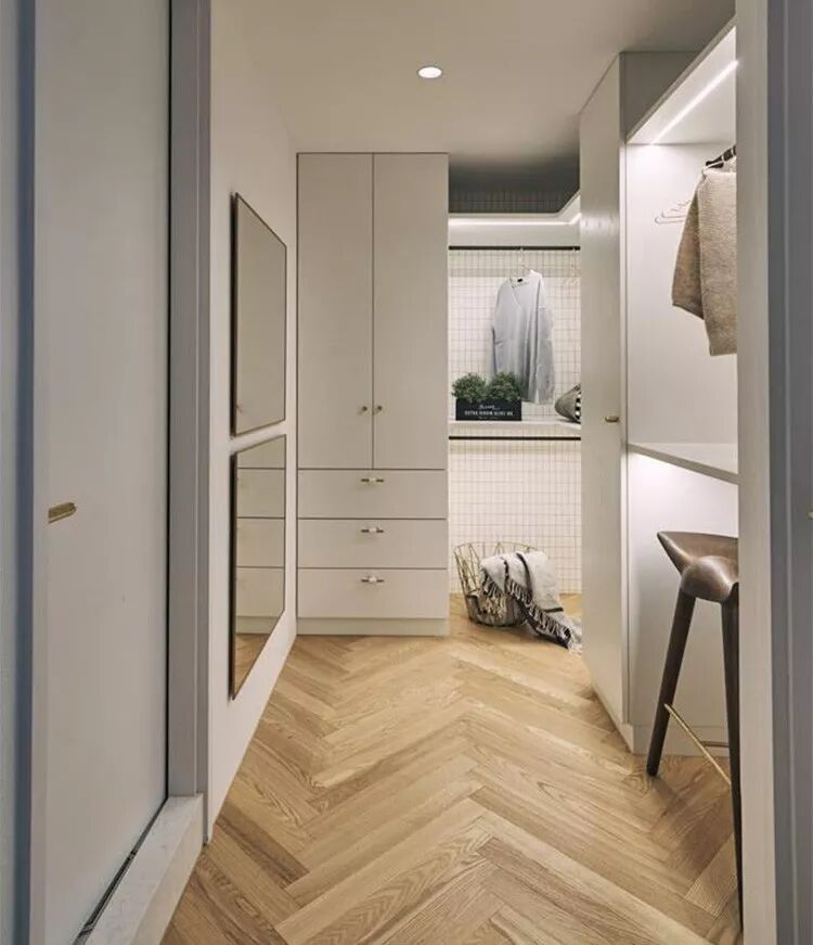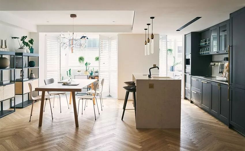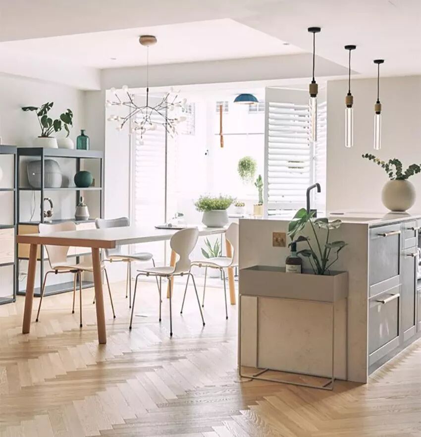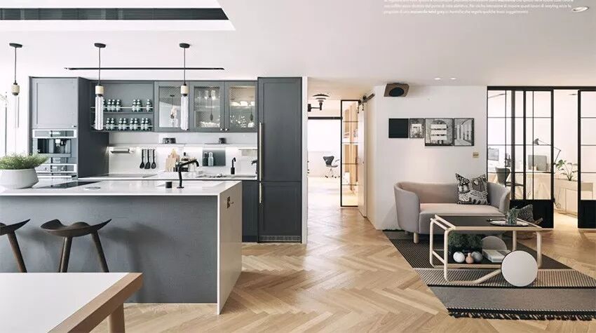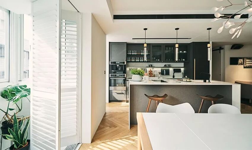 开放式厨房以黑色系统橱柜和白色石英石面的中岛构成,带出简洁俐落的视觉分量,将冰箱和烤箱隐藏在橱柜,深浅交错的人字拼木地板串联室内场所,为简单清新的空间提供恰到好处的立体感,交织出优雅暖意。