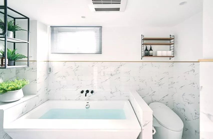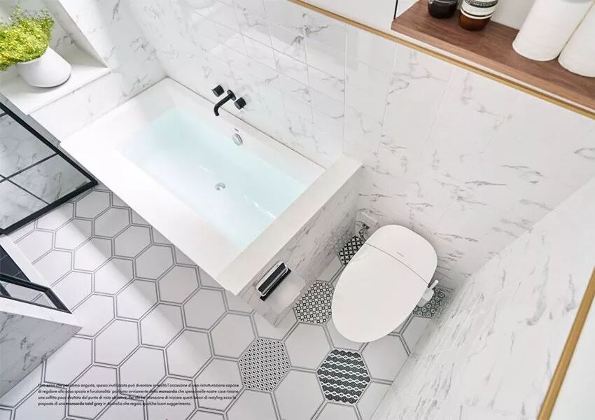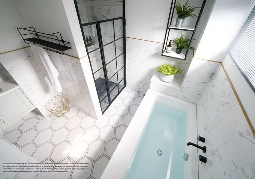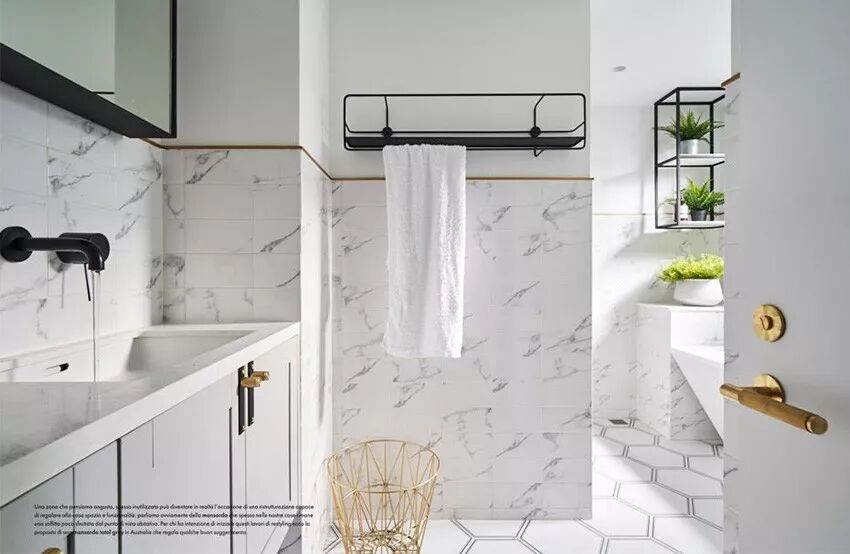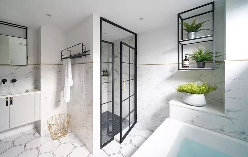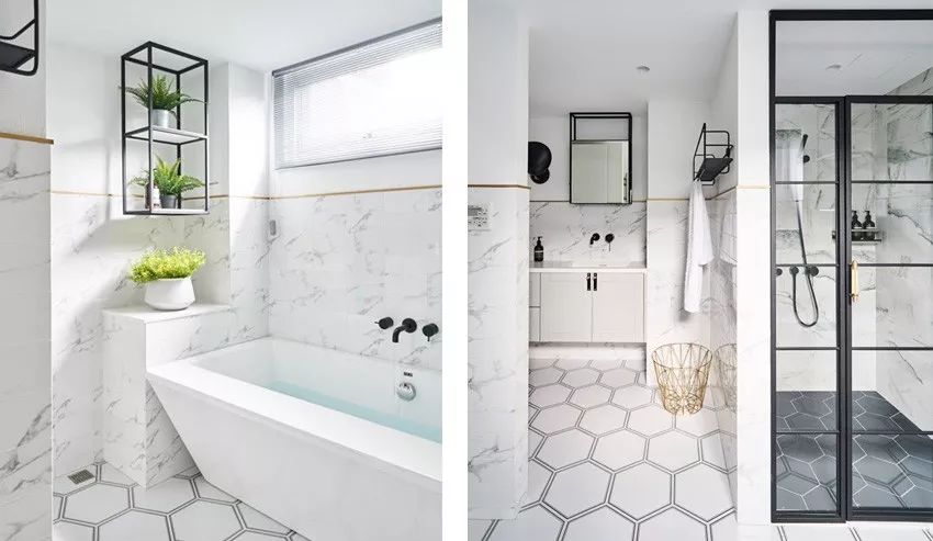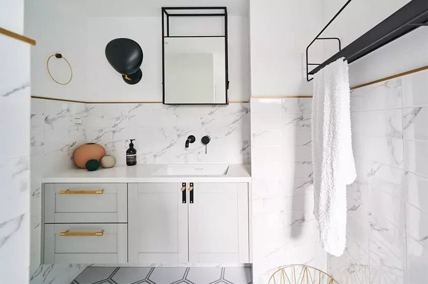 主色调为白色系,几何图案地砖与纹理效果的壁砖让空间不至流于单调,搭配黑色铁件、金色把手及置衣篮,体现优雅大方的生活格调。