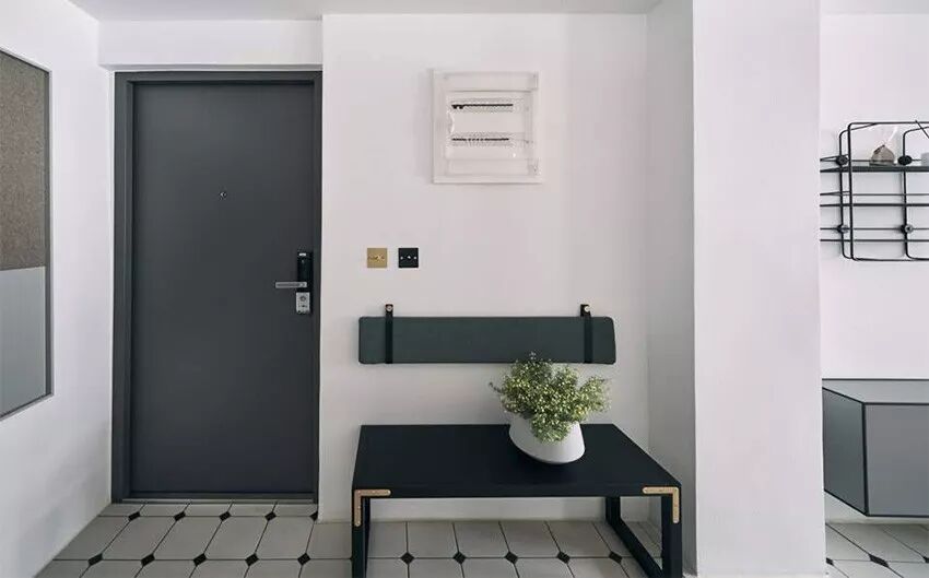 落尘区采用黑白棋盘格花砖,明确界定空间,设有穿鞋椅、镜子、吊柜结合衣帽架,隐藏式鞋柜的另一面则做为电视墙,兼具多功能实用性及设计美感。