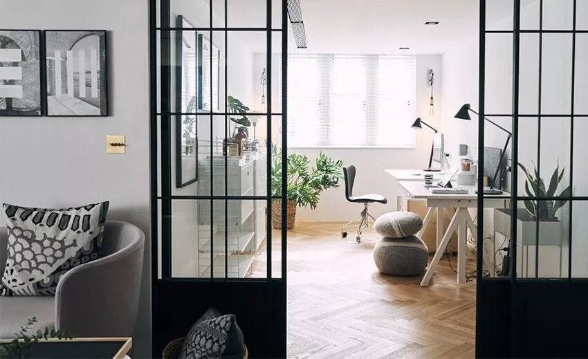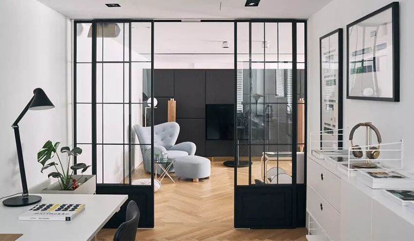 铁件玻璃拉门隔开书房及客厅,保有穿透性同时呈现轻盈淨透感;考量小孩成长期身高可能快速抽高,选择升降式书桌灵活调整高低。