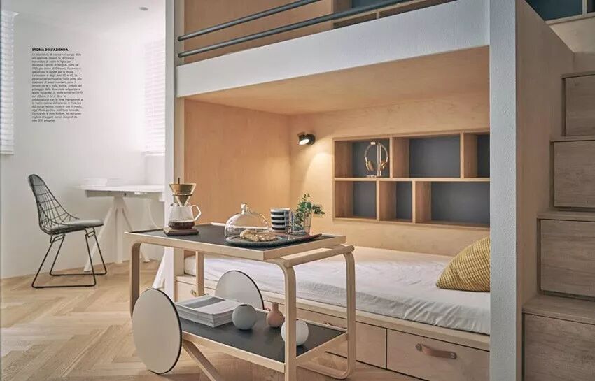 上下卧铺赋予新奇趣味感,床铺大小为成人也可舒适入睡的尺寸,即便小孩长大也能继续使用,并可招待客人来访时休息。崁入式壁柜可放置摆饰品,并以小壁灯点亮温馨气氛,楼梯及床铺下方均规划收纳空间。