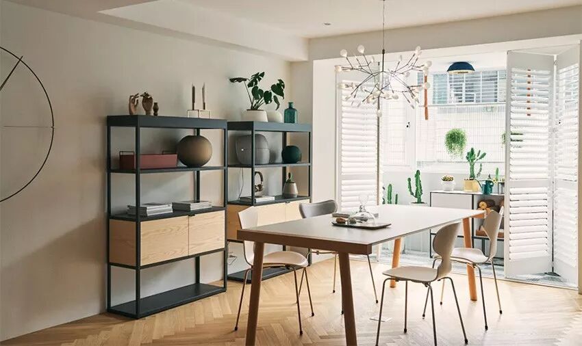 以白色百叶门隔开阳台和室内空间,弹性调节採光及通风,选用白色原木餐桌搭配不同颜色的餐椅,呈现清新感,具设计感的吊灯点缀温暖气息。