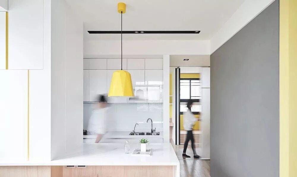 厨房吊灯也刻意选黄色有折线的款式