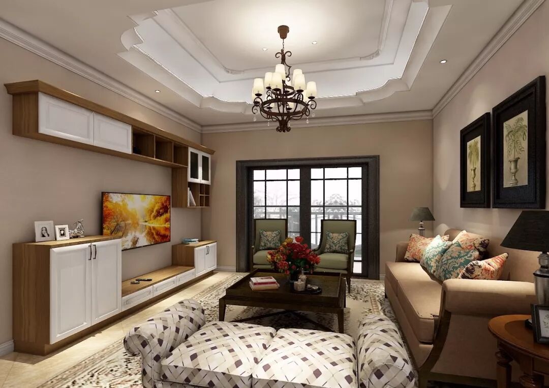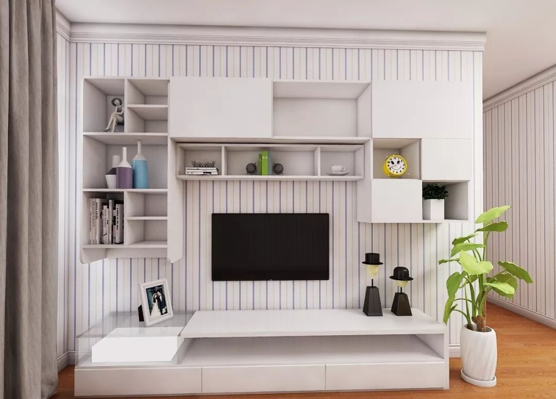 电视柜主题颜色与沙发、墙纸相契合,不显突兀。围绕电视,柜体虚虚实实,跳跃式设计增添客厅一丝的灵动感。