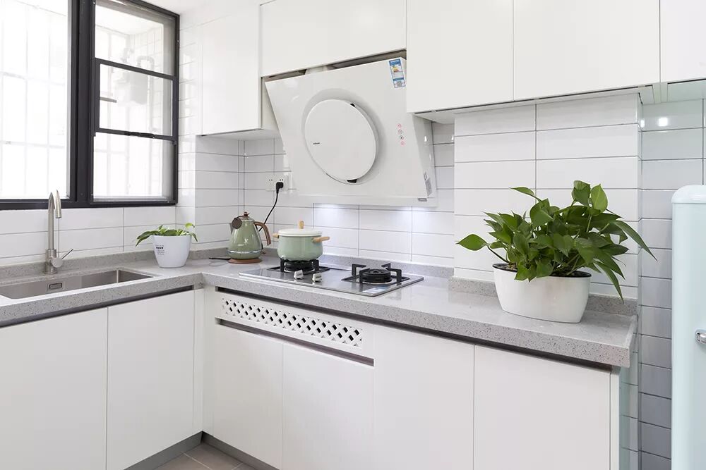 ② 厨房。厨房柜子主要是强收纳方便使用清洁,无把手设计在厨房有限的空间里避免碰撞;把手容易藏污纳垢,清理起来很麻烦,无把手设计则免去这样的烦恼。