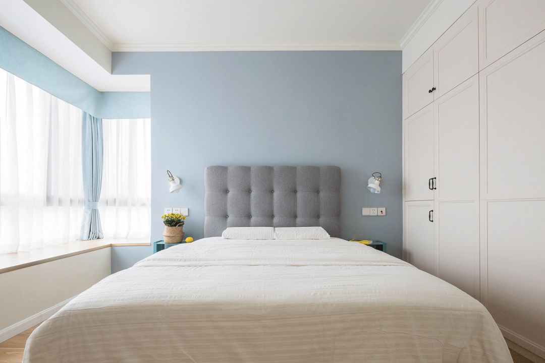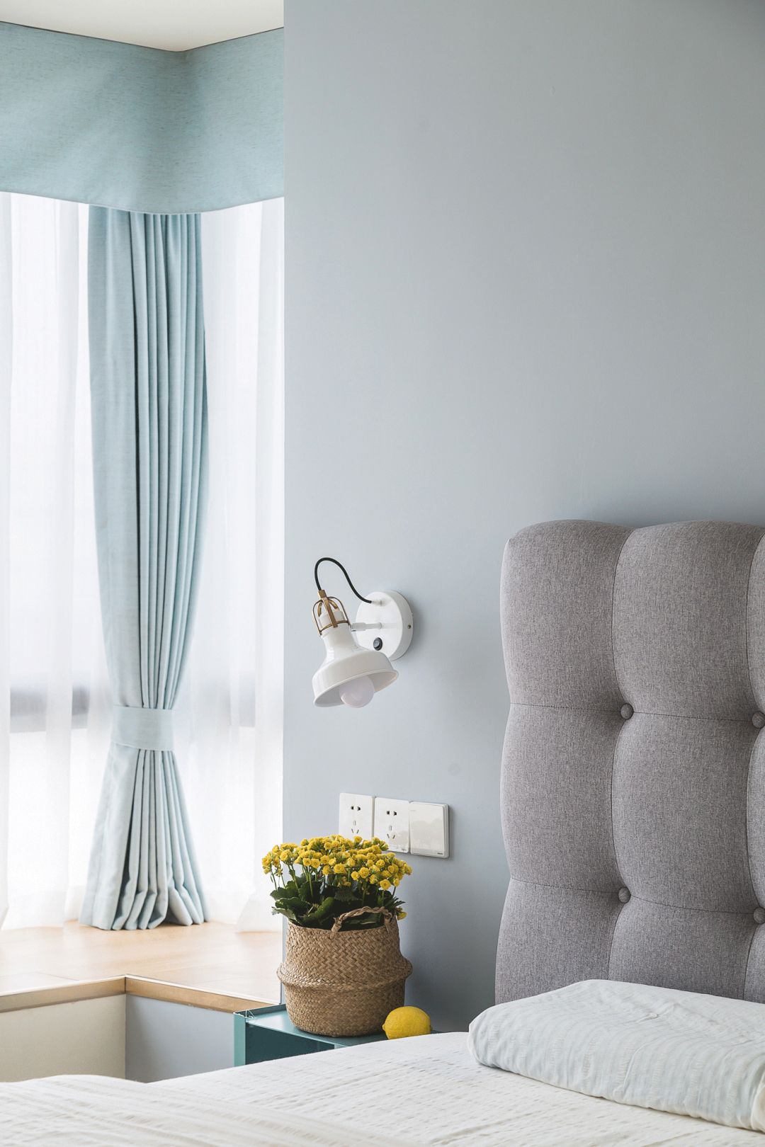 主卧室的衣柜设计成了嵌入式的,没有占用多余的空间,看上去比较整洁干净。床头的小壁灯,为睡前的阅读,提供了很好的光照。