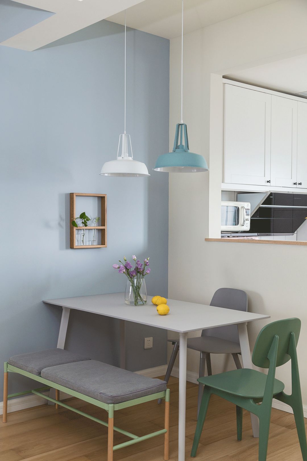 天空蓝的墙壁搭配白色的厨房,再加上木质的地板,有蓝天和大地的感觉,清新自然。