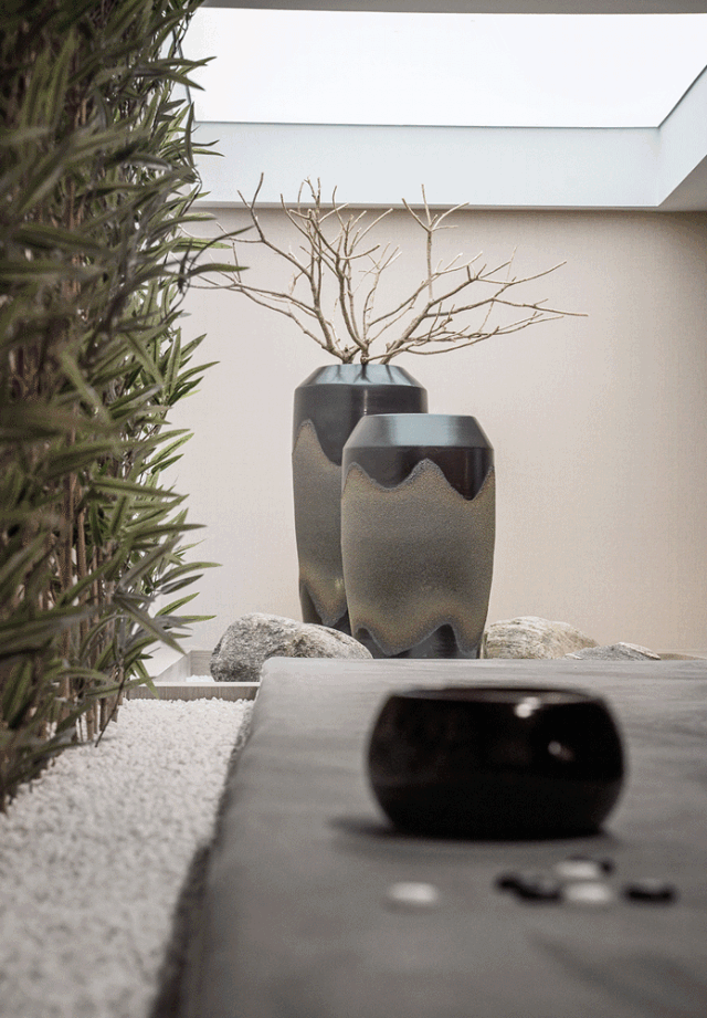 夹层的茶室是一个开放式场所,墙壁镂空的环形设计使茶室与冥想室产生交集,空间变得更加通透。室内氛围以“自然隐喻”,古松苍翠挺拔,使空间和感观都溢出向上生长的力量。