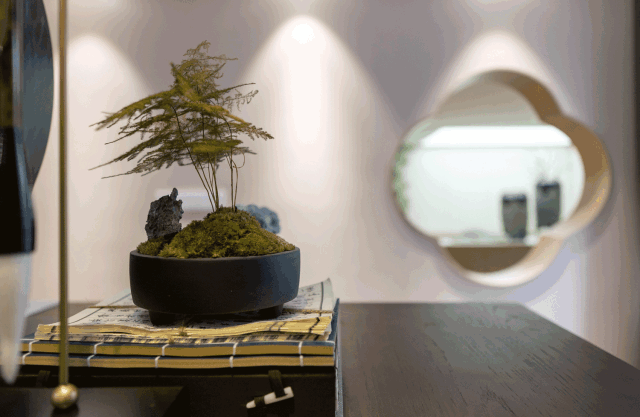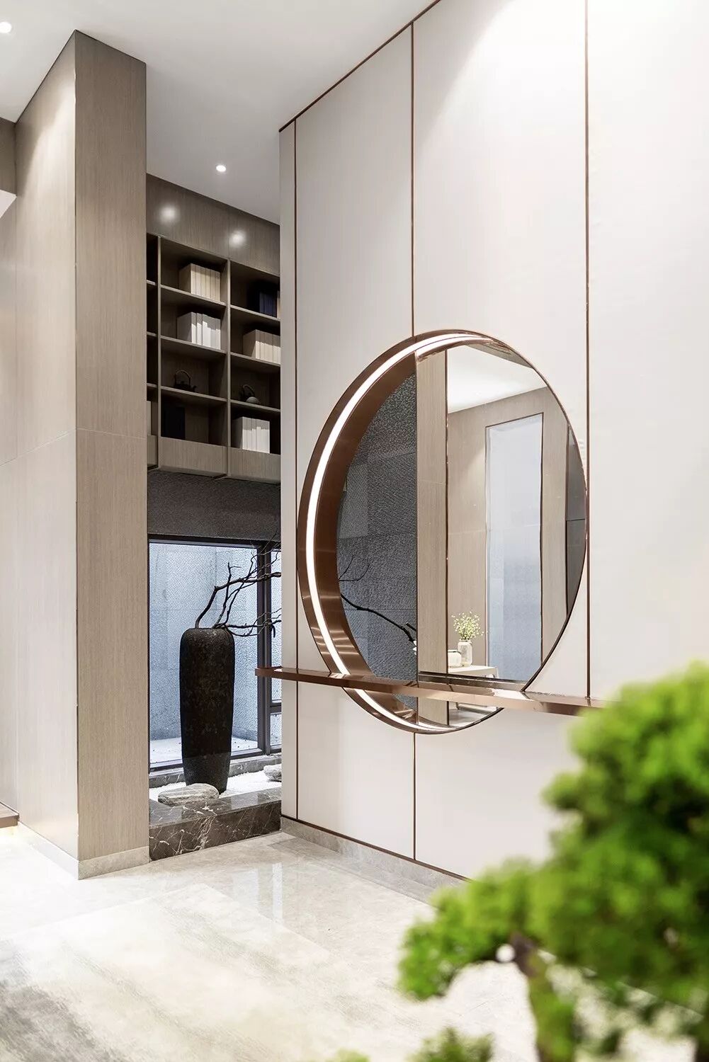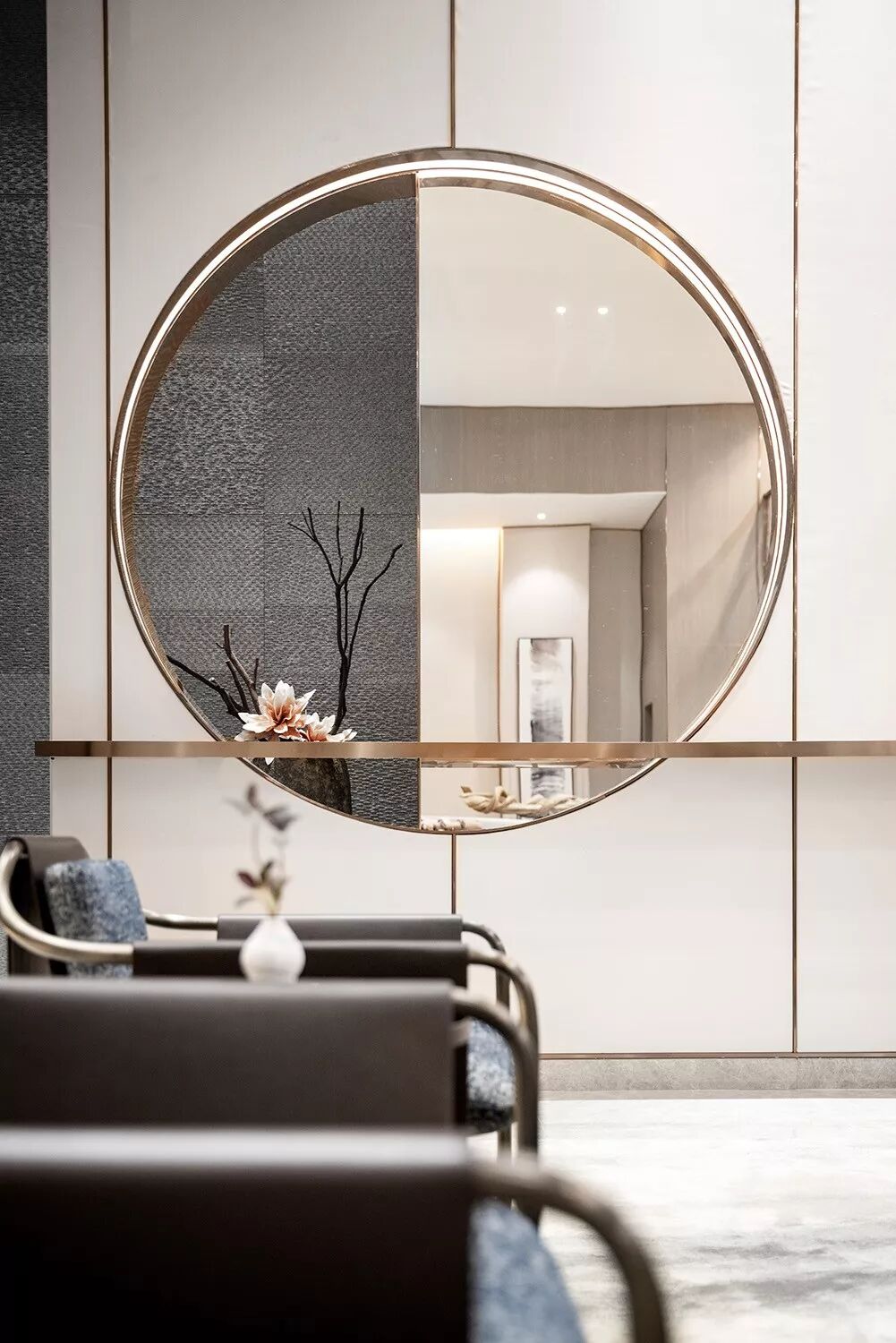 此空间的主幅造型无比抢眼,以一个镶嵌在墙内的圆为形,居中藏匿灯带,半虚半实,一边的镜面映射出室内的场景,而另一边则直接透过圆形看到背后的隔墙,用充满粗粝感的暗色米白麻石花岗岩,辅以修饰的凄美花树,绘制出一幅传递苍凉感的画作,与镜中画形成一种强烈对比。