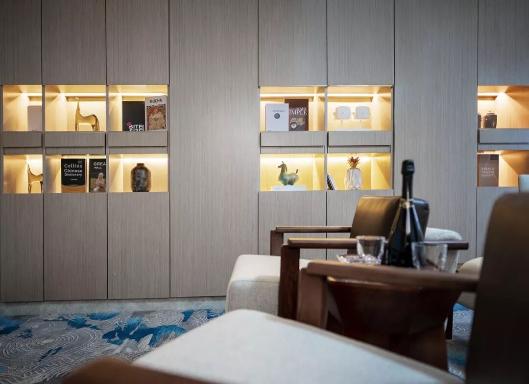 此空间广而高,块面间木饰面与扪皮完美结合,用于分隔和柔化转角的不锈钢条避免了颜色的单一,金属色亮片为空间增添一丝灵动性。