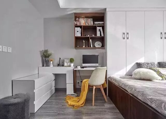 关于榻榻米两端带什么类型的柜子,可以根据自家的需求来定。比如家里储物空间少,那两端都可以设为封闭式衣柜;如果需要一个大书柜,那么两端可以分别是衣柜和书柜。