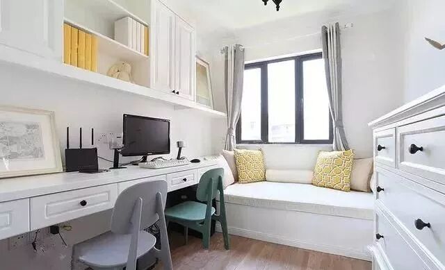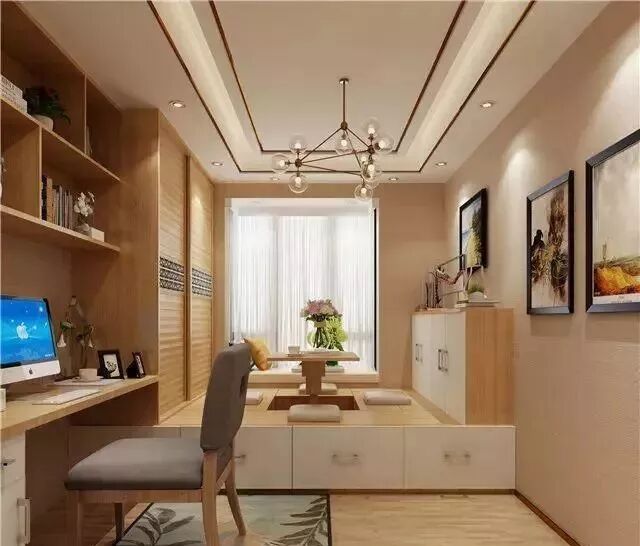 双人工作台都可以轻松搞定,如果书房偏小的话,榻榻米完全没必要装太大,只是一个休息地方而已。书桌悬空安装,墙壁上装上书柜,这样的书房岂不更美观实用呢。