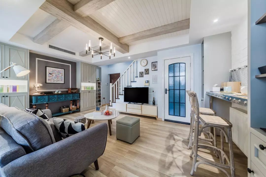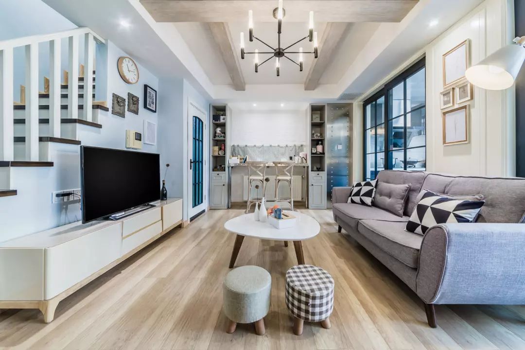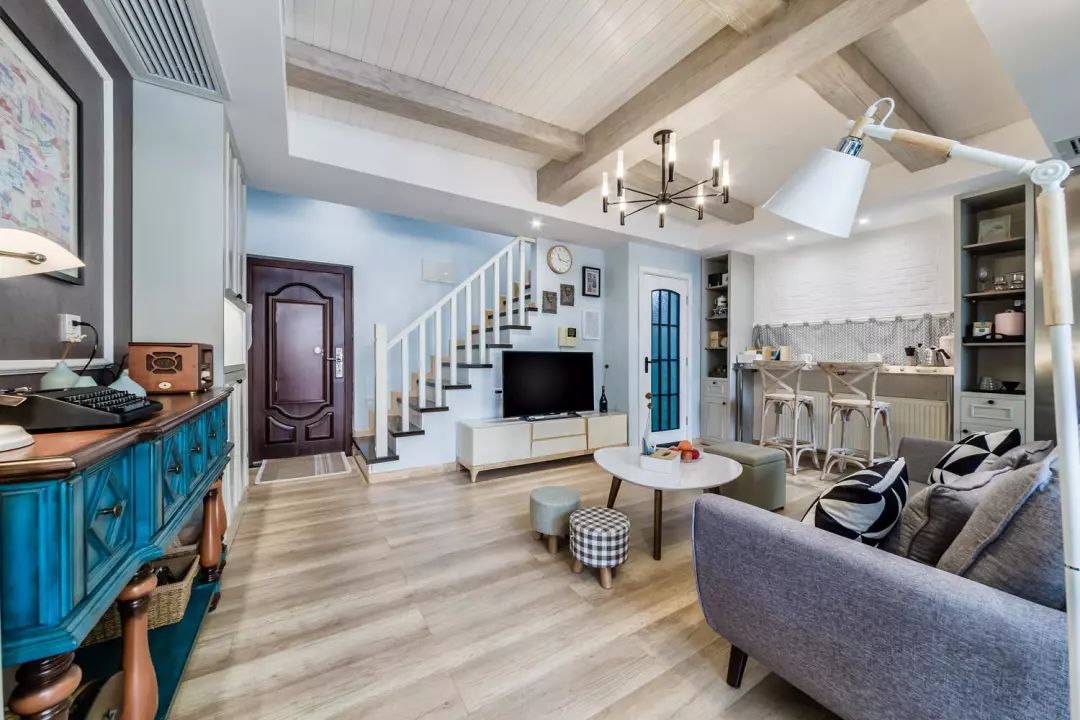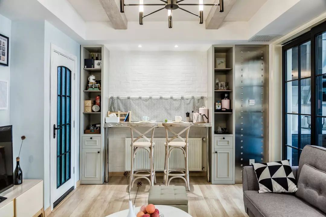 这就是推开门的景象。整体空间以素白,灰系,木质为基础,再用温润的淡蓝色相调和,恰当的加入工业风的元素,让家既温馨又俏皮。