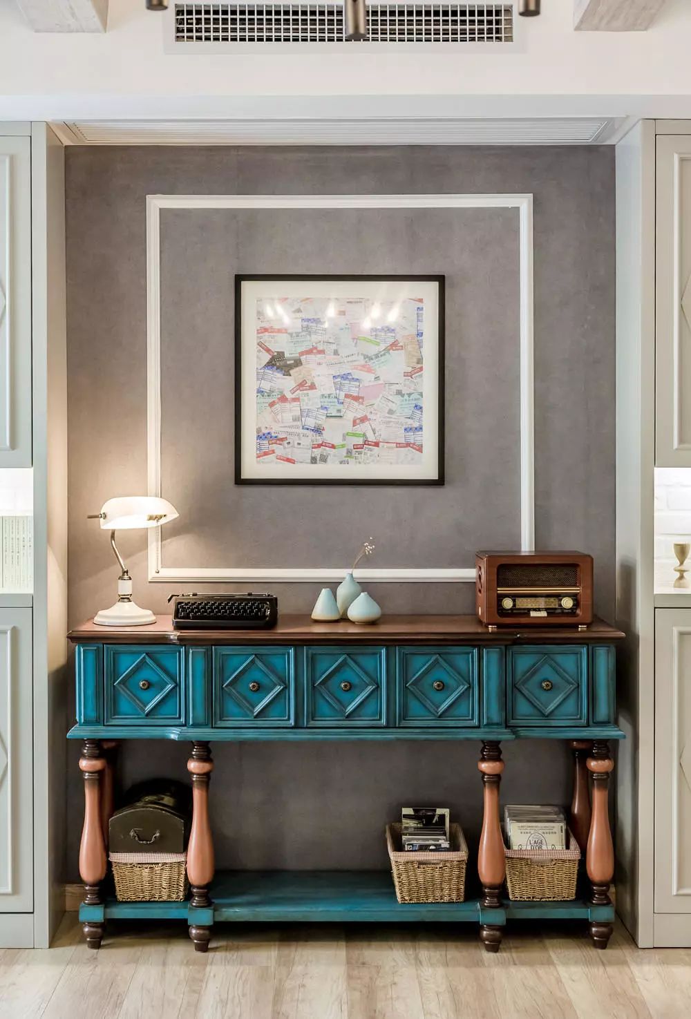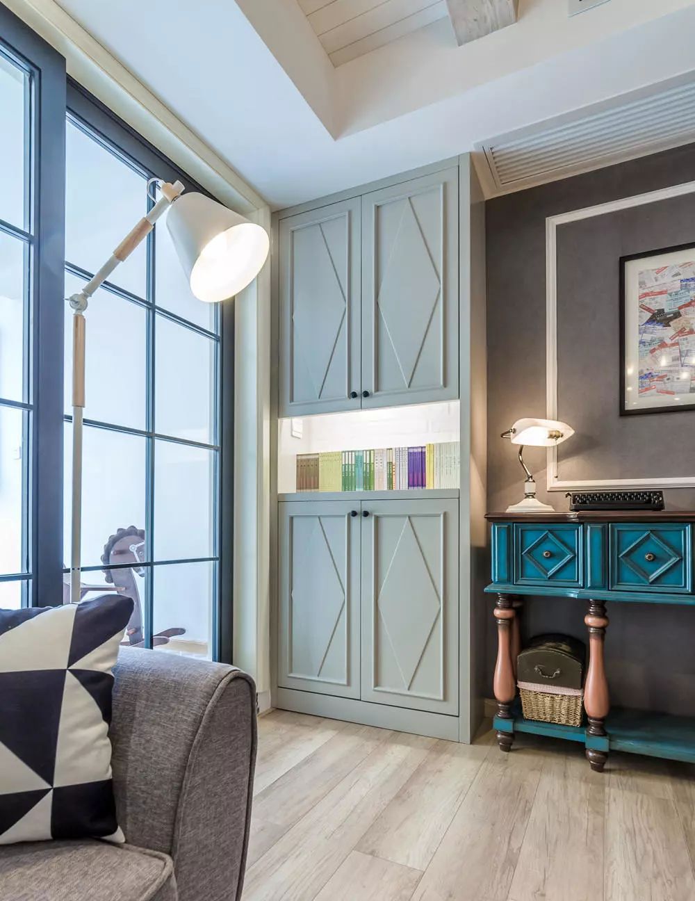 蓝色系精美的斗柜装饰着这个独一无二的空间,又与整个大空间融为一体,各种复古的小摆件也让这里增彩不少呢!