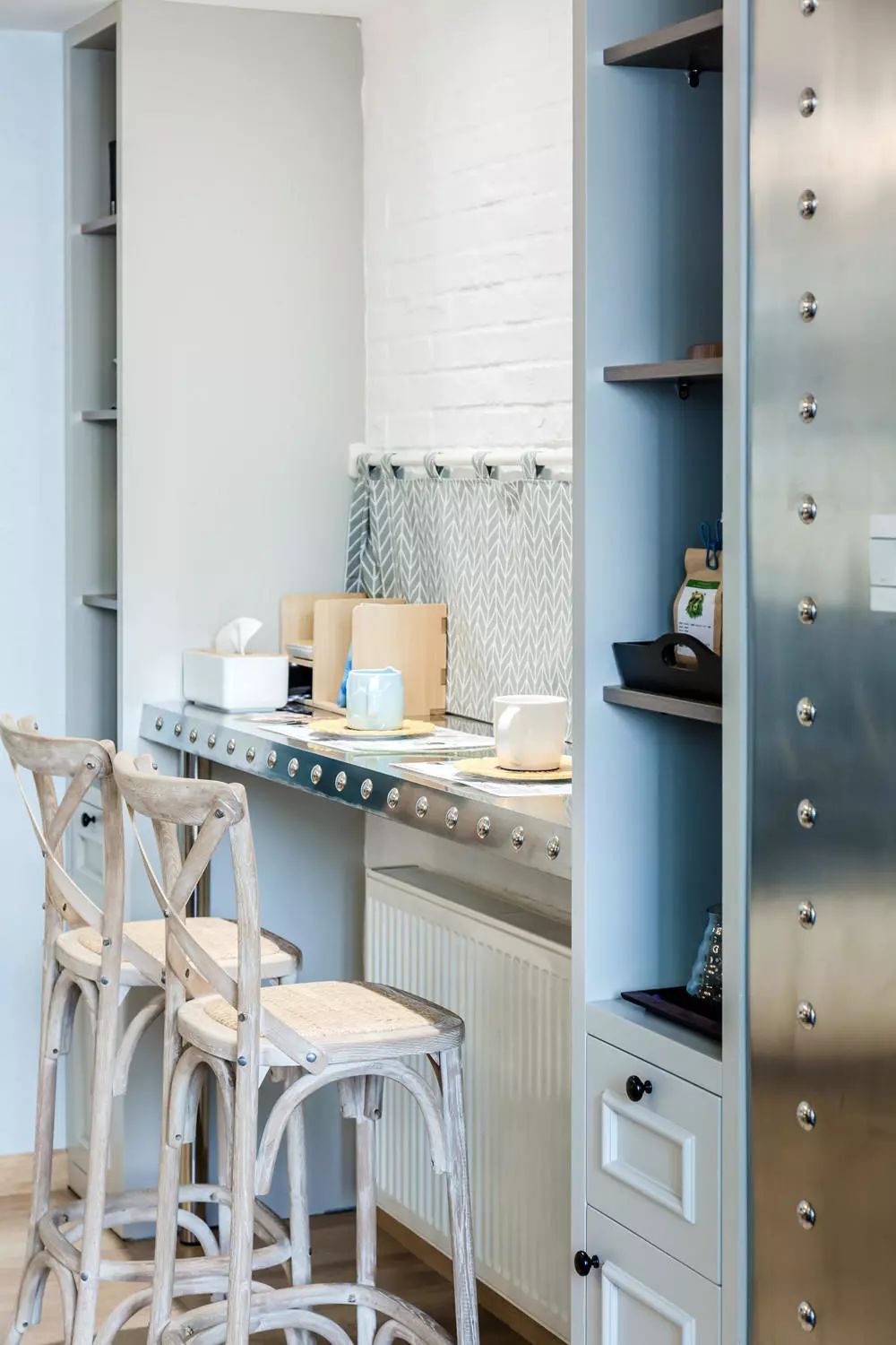 灰色系的吧台式餐桌带着点工业风的气质,充分利用着每一寸空间,银色铁皮与牟钉的搭配文艺美丽,带点低调的宁静感,吃饭前不拍照都觉得对不起这么有逼格的用餐环境。
