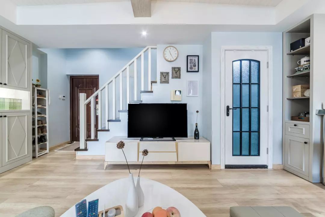 充分利用每一寸空间,把电视背景设计在楼梯的侧面,简单挂上几幅装饰画就大功告成啦!