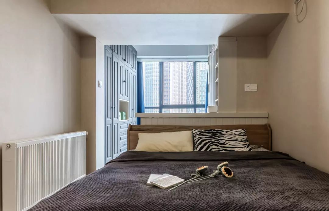 卧室同样的极简风格,让这里少了些累赘,由于空间局限,设计师把床横向摆放,海巧妙的设计出一个小吧台,可以看看书,喝喝茶也是不错的呢!