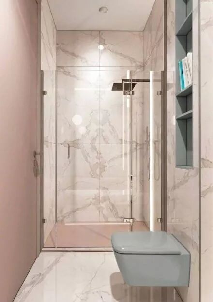长方形的卫生间是最容易设计了,最里面是淋浴区,中间是马桶,外面是洗手池,刚刚好。