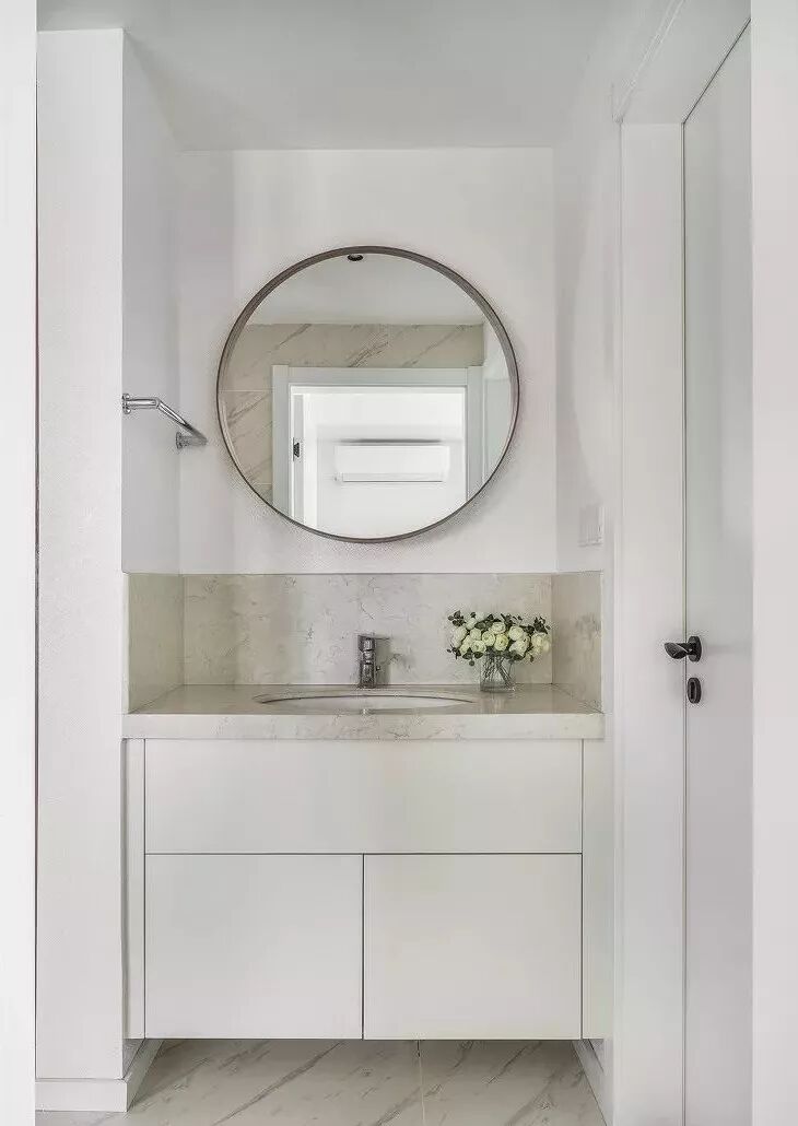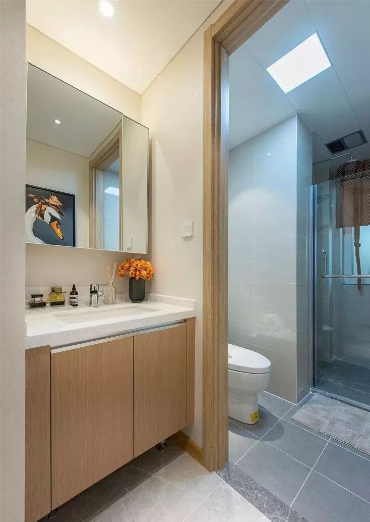 最为彻底的干湿分离,就是把洗手台直接移到门外,借用部分外面的空间,让卫生间里面的淋浴区,可以宽敞一些。
