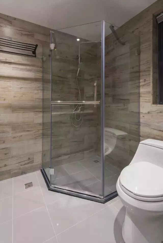 ▲干净整洁的卫生间,看起来让人很舒服。墙面看上去是木地板,其实是瓷砖。