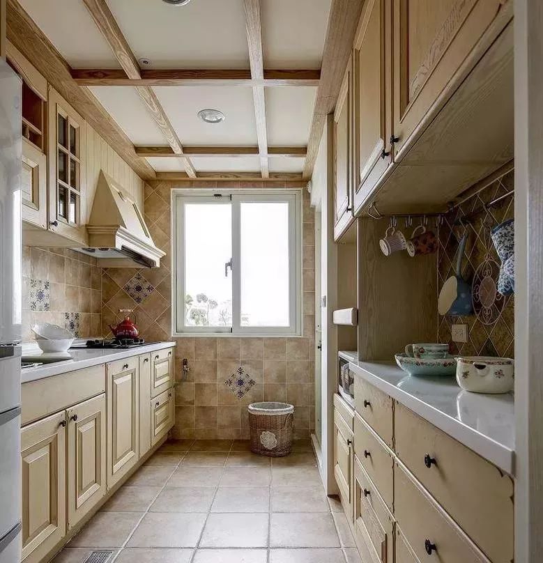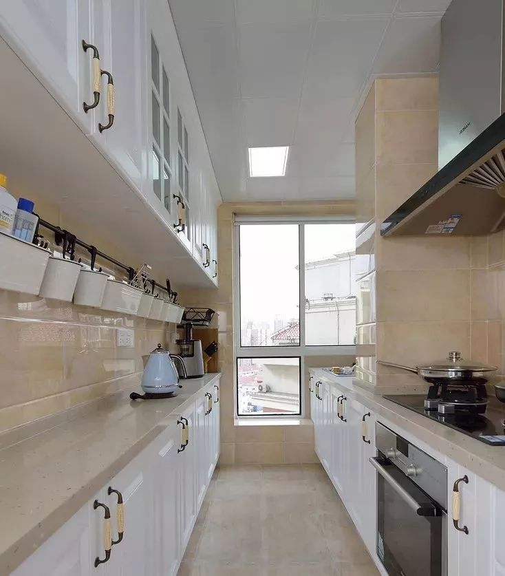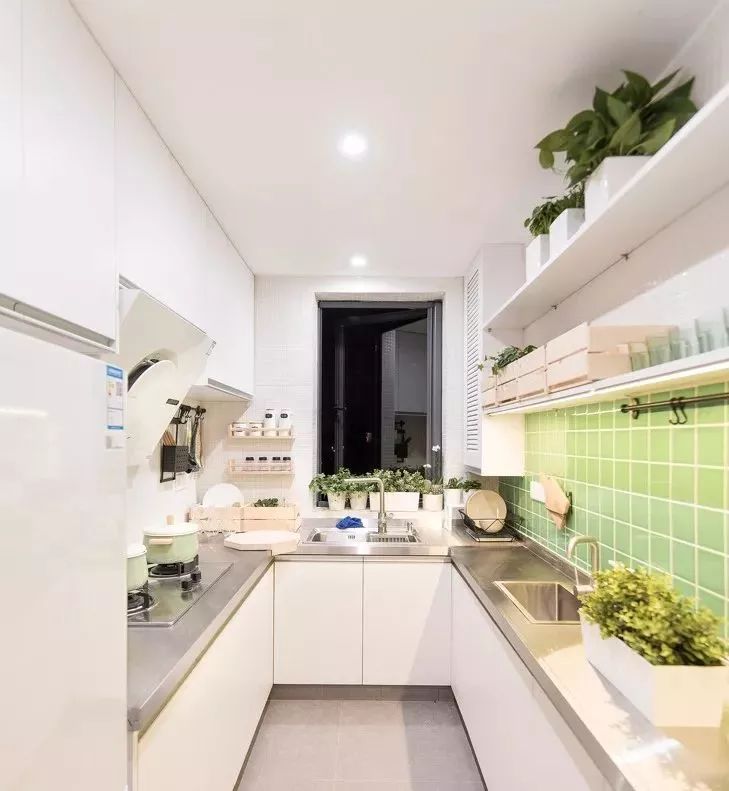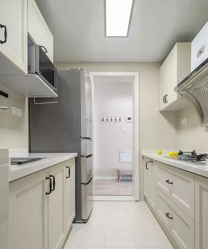 厨房门开在厨房中间的话,建议这种过道型厨房可以设计成二字型布局。如果厨房比较大,也可以将岛台和墙面平行摆放,这样布局同样合理,并且空间利用率极高。