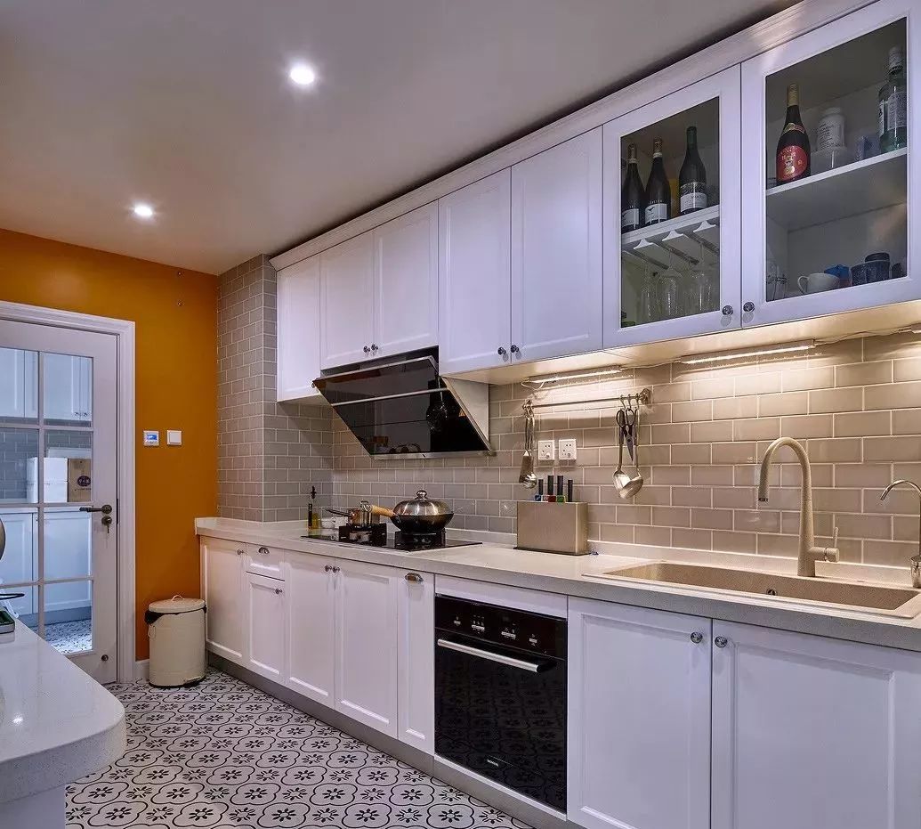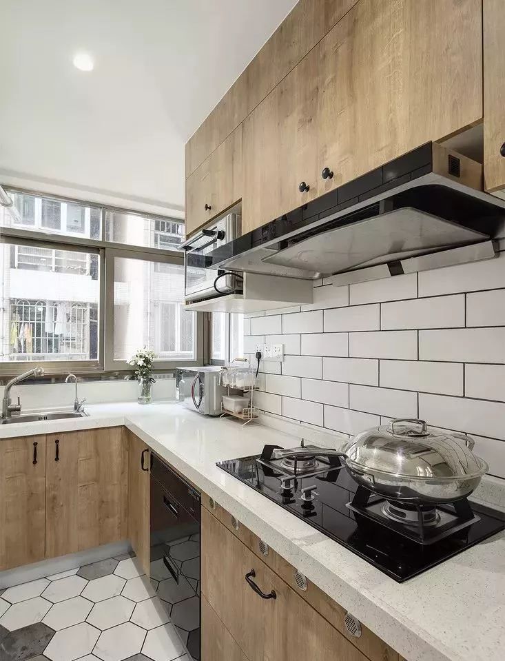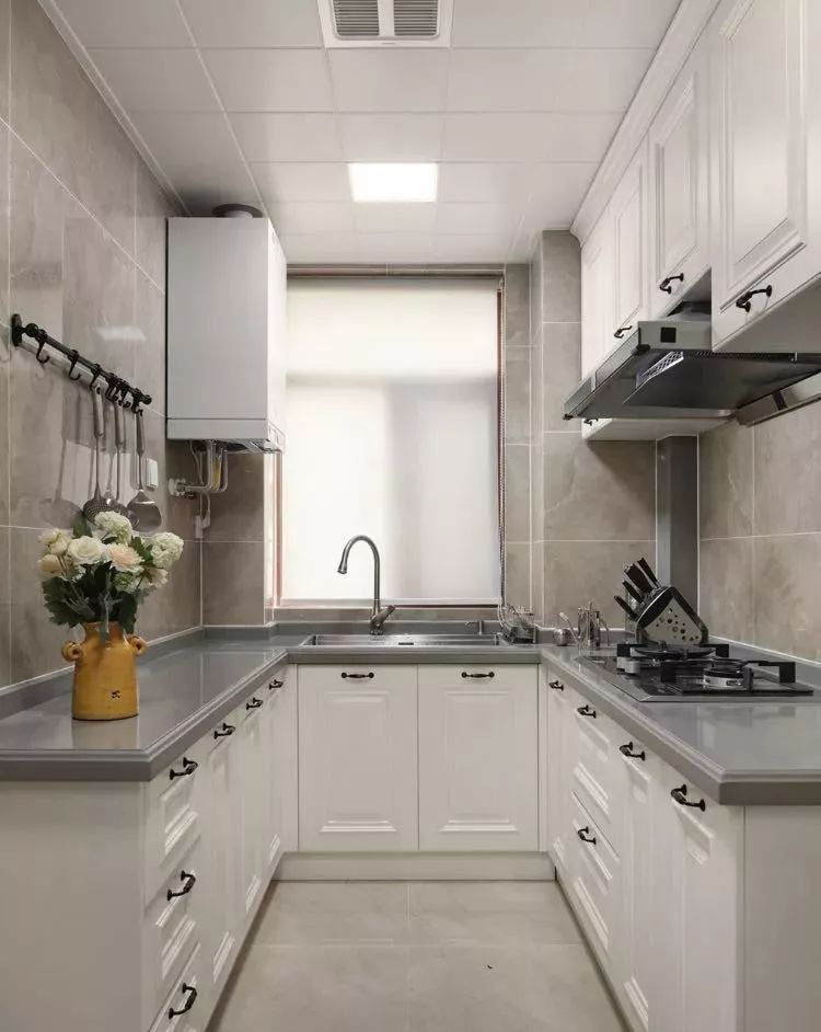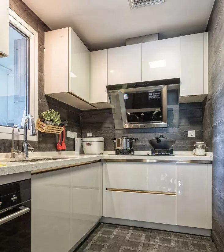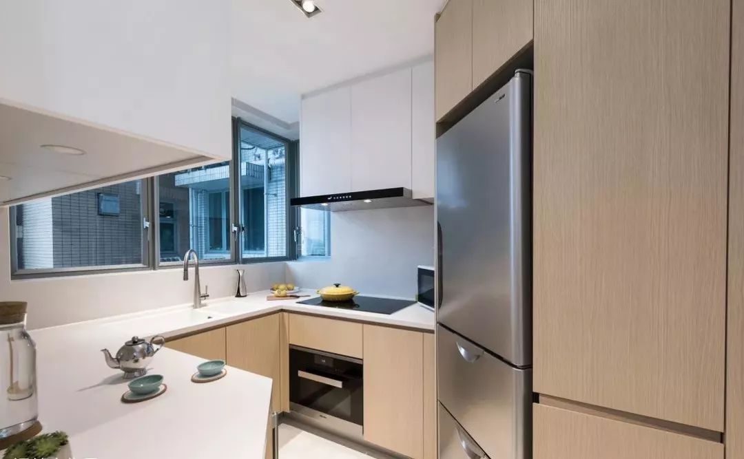 一般的厨房都偏长,而长方形厨房较为适合设计L型橱柜,这样不仅空间利用率直线飙升,还能留出空间给业主适配各种厨房家电,增强厨房的兼容性。