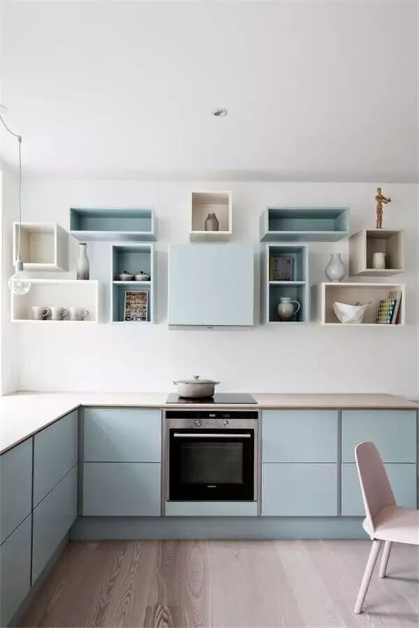 蓝色系橱柜给人一种清凉的感觉。