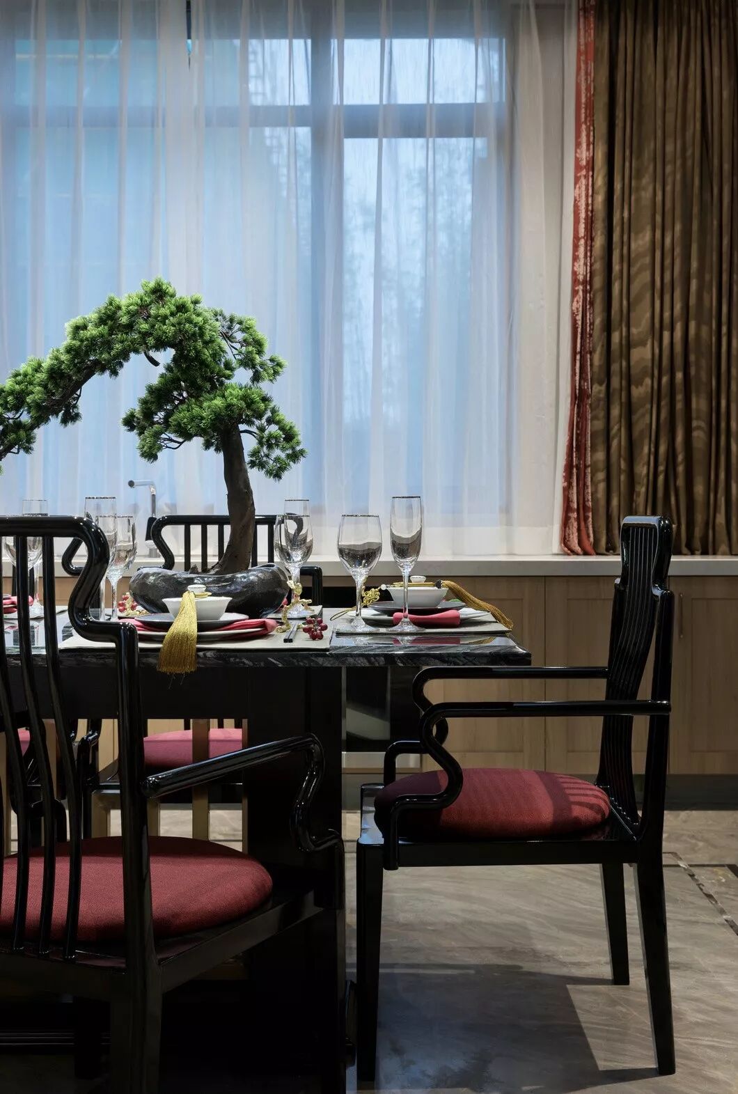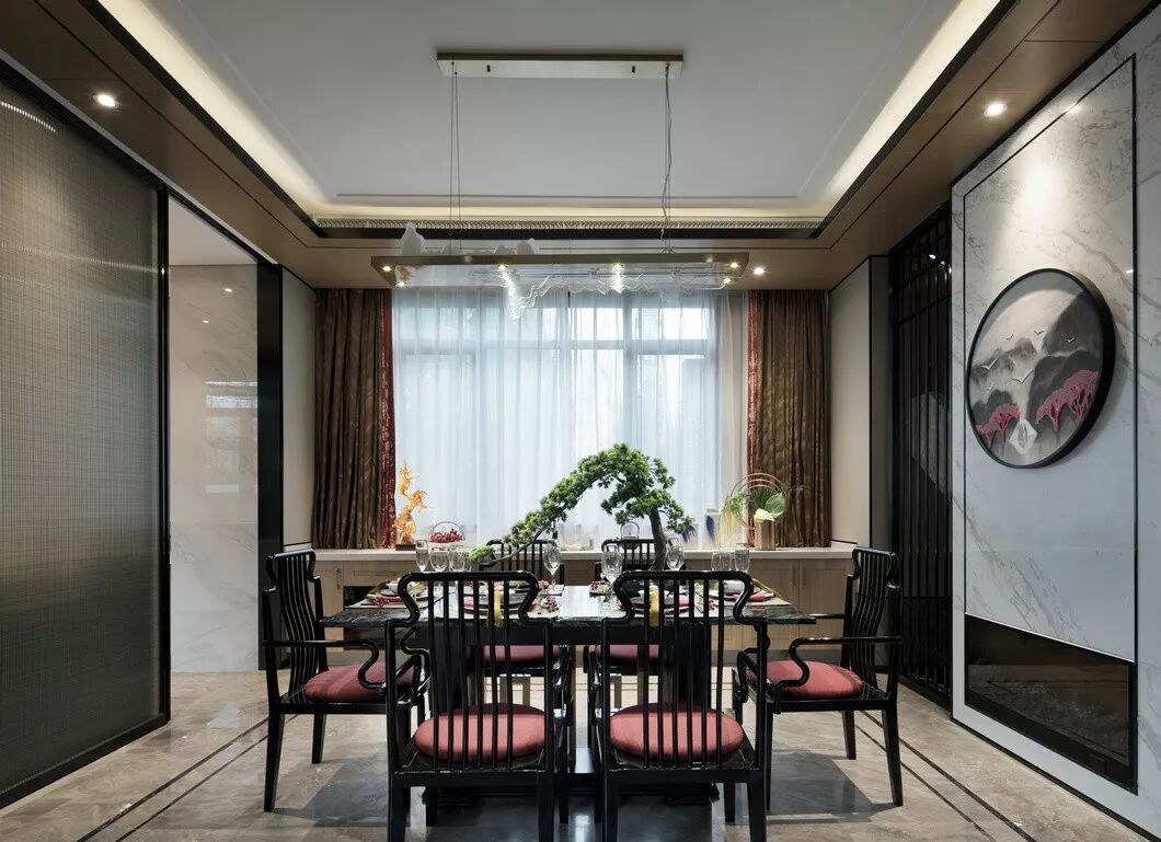餐厅空间摆设简洁的方形大理石餐桌和黑色木质座椅,简练的线条配以红色坐垫,延续现代中式意蕴。