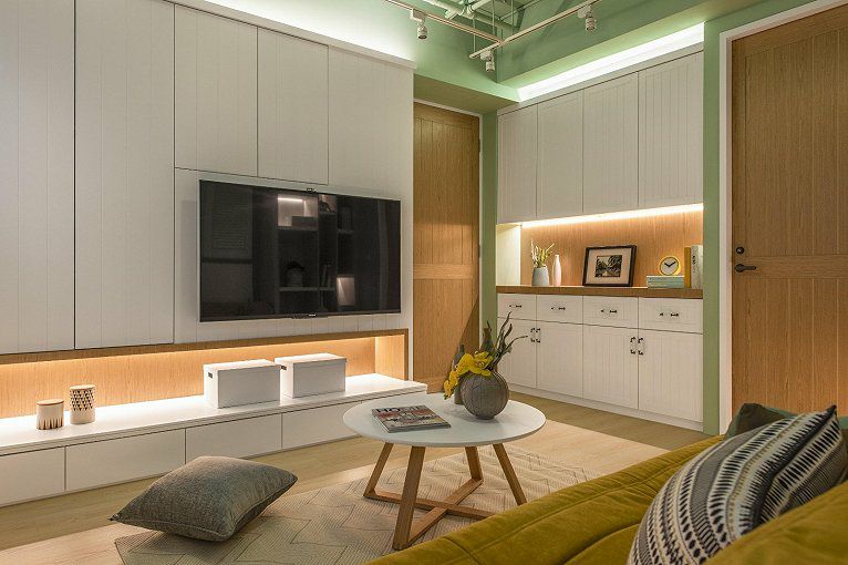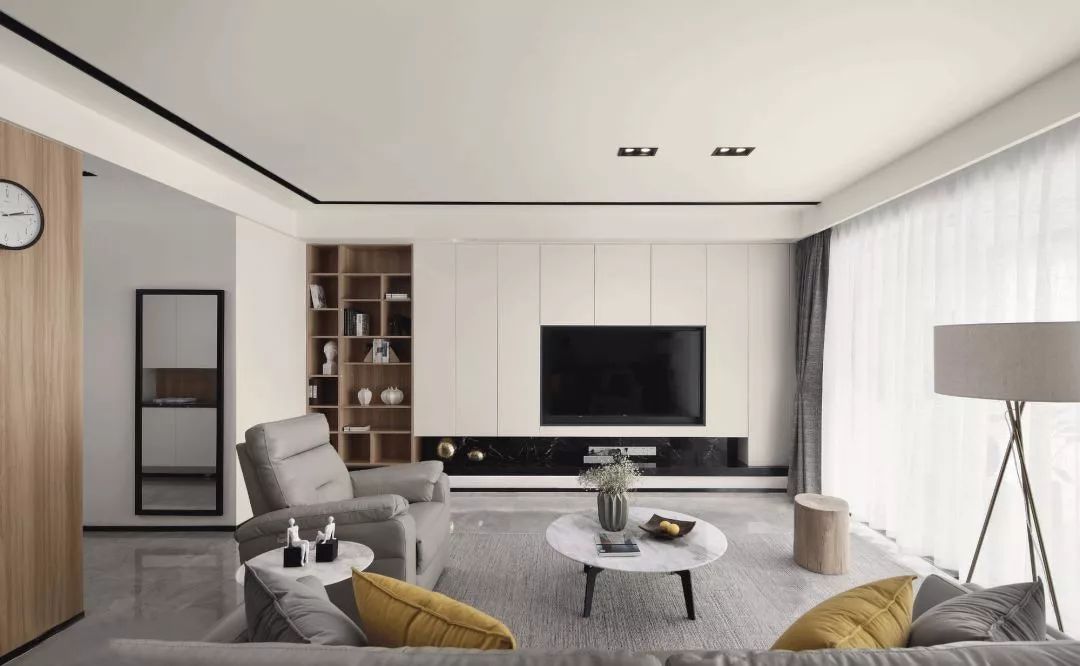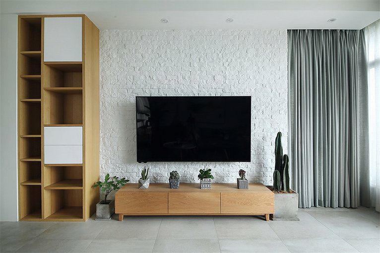 如果家里有很多物品需要收纳,我们可以巧妙的利用电视那面墙,对电视柜的外观加以重新的定义和划分,让电视背景墙空间呈现出多层次的魅力。
