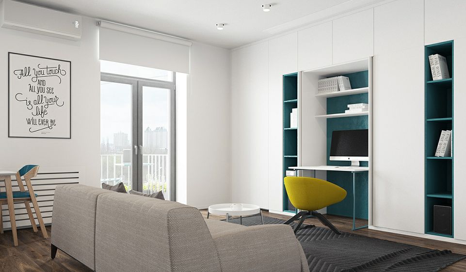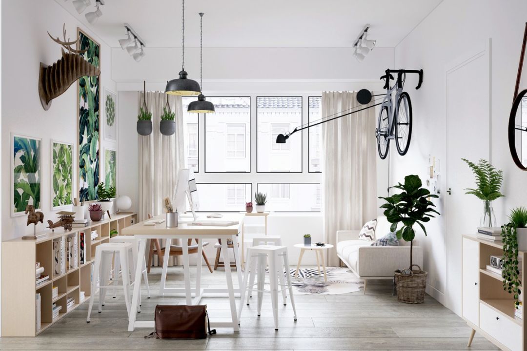没有电视,客厅的沙发与茶几也不必受限制,在客厅放置一个大书桌,能满足在家办公的需要,敞开式的办公区能不仅更好的陪伴家人,使用也非常方便,同时还可以兼做上网区和宝贝的学习区。