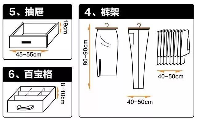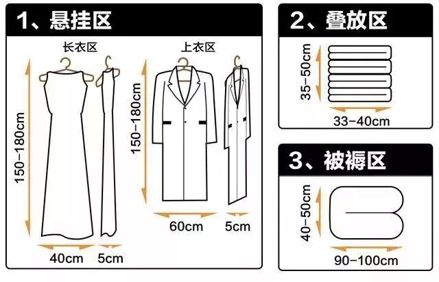对于年轻男女来讲,衣服的款式更加多样,如果是年轻夫妻,最好设置男女专用的储衣空间,储衣区最好是以悬挂收纳为主,衣柜内部各区具体尺寸可以参考下图。